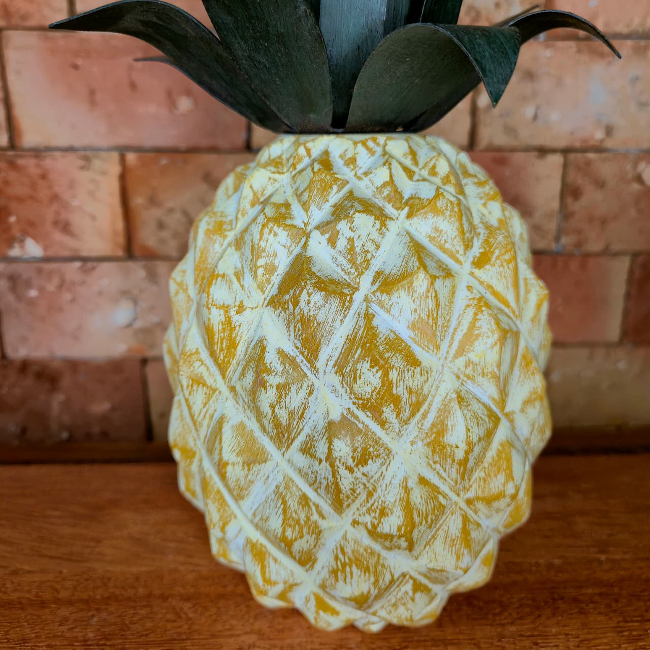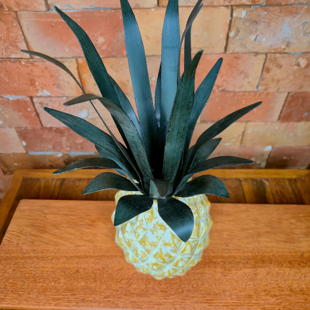 Abacaxi decorativo produzido na madeira com coroa de ferro. Detalhes de pintura artesanal.