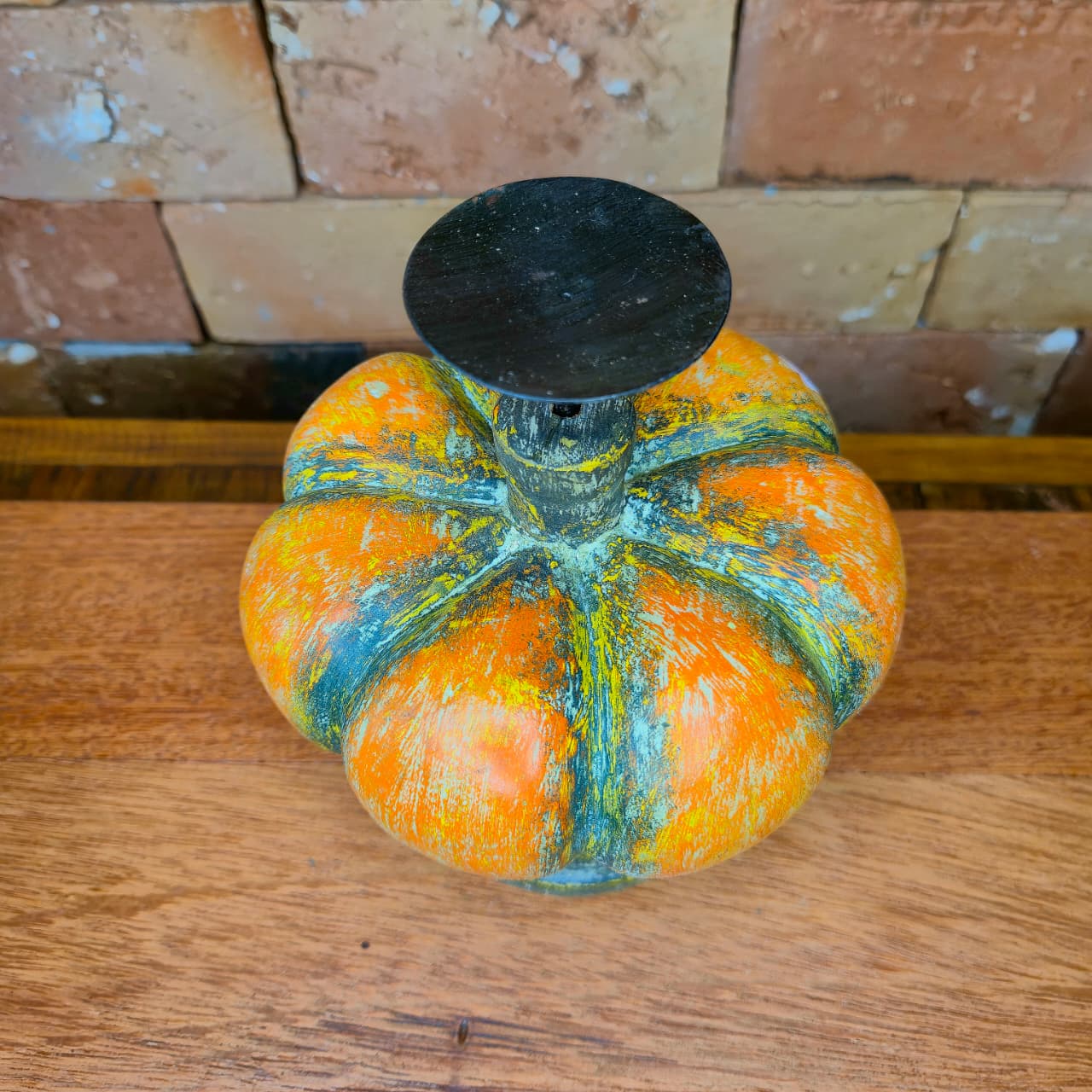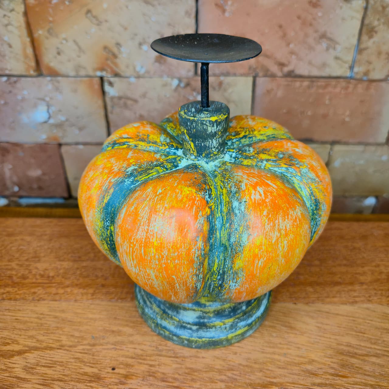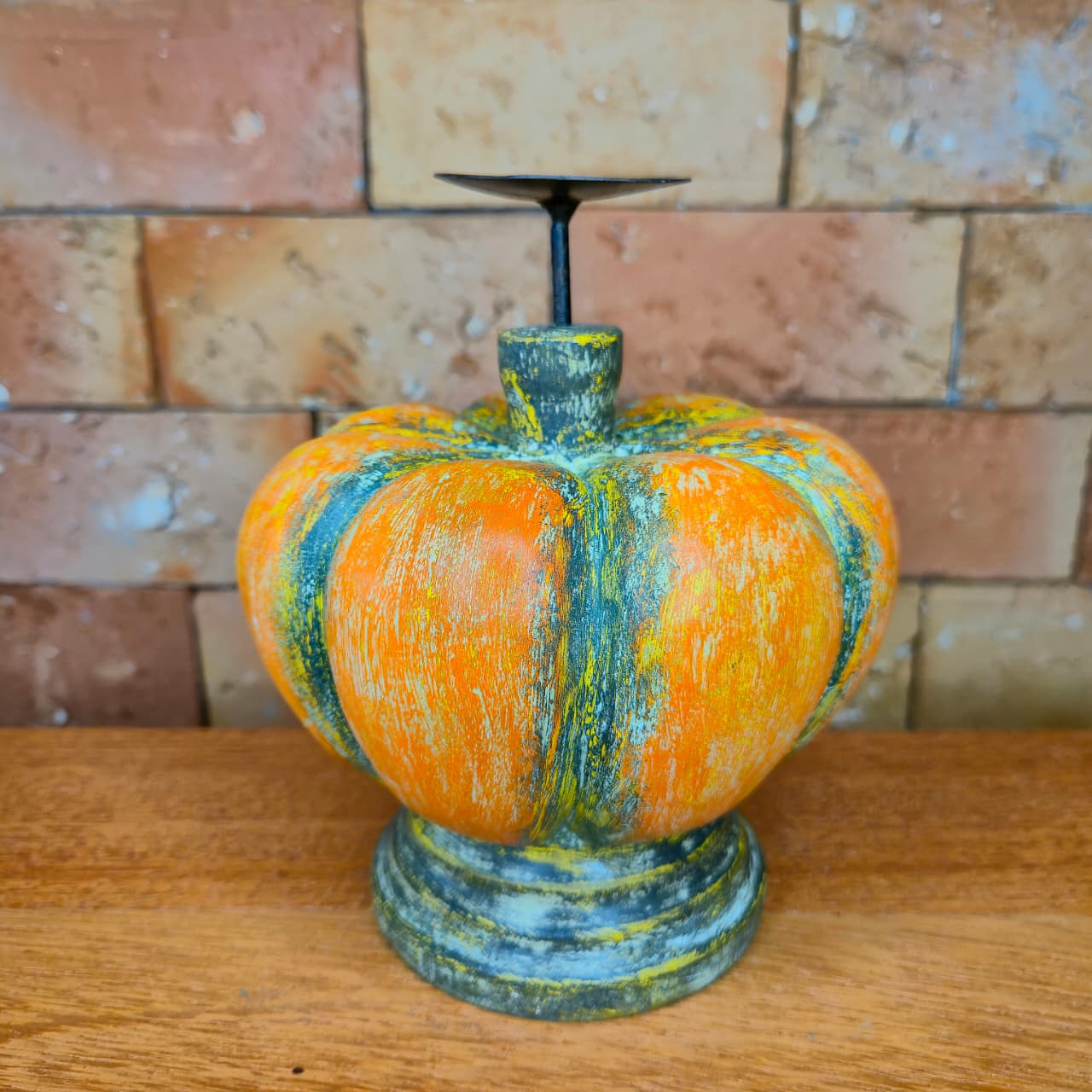 Abóbora castiçal decorativa produzida na madeira com castiçal de ferro. Detalhes de pintura artesanal.