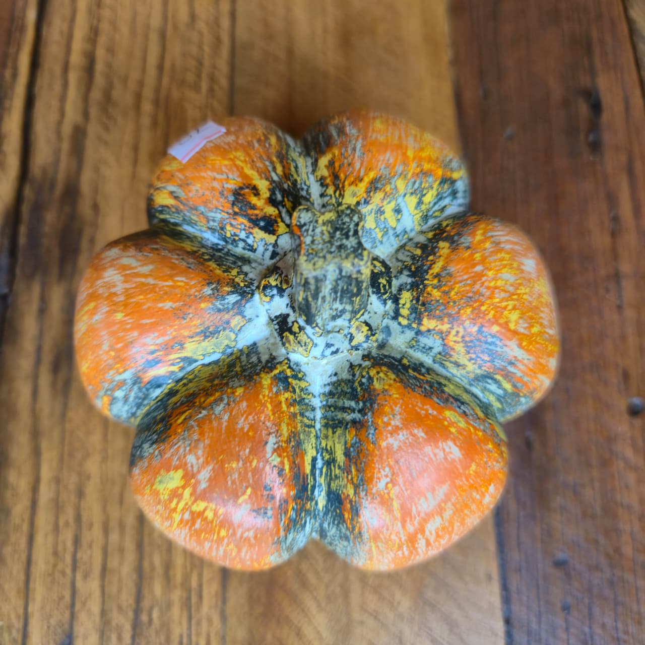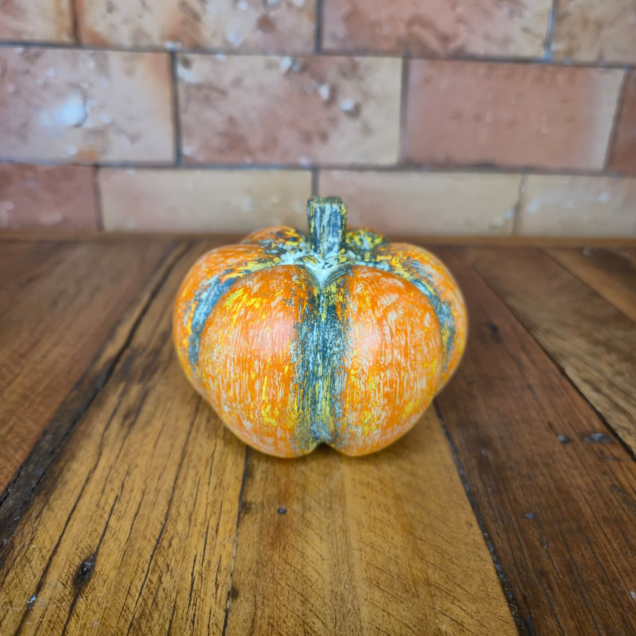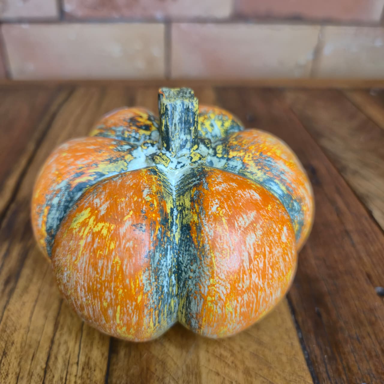 Abóbora decorativa produzida na madeira com detalhes de pintura artesanal.