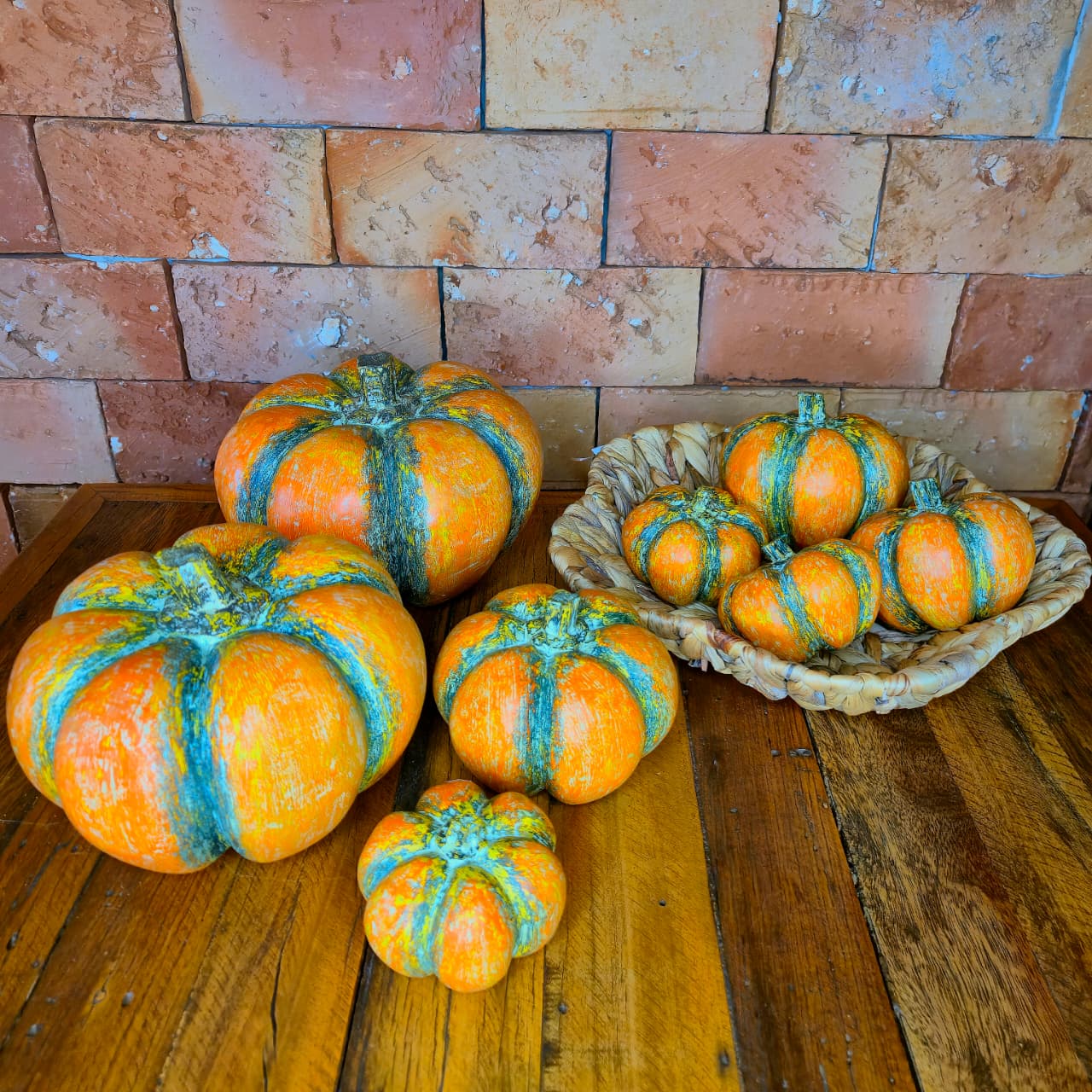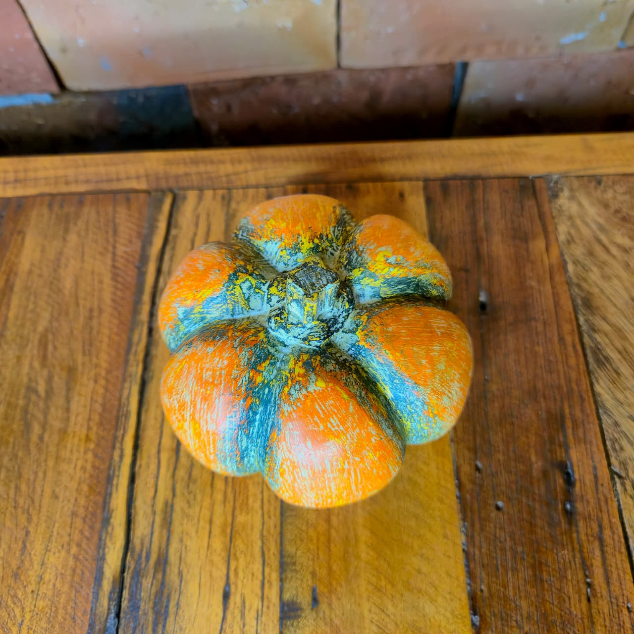 Abóbora decorativa produzida na madeira com detalhes de pintura artesanal.