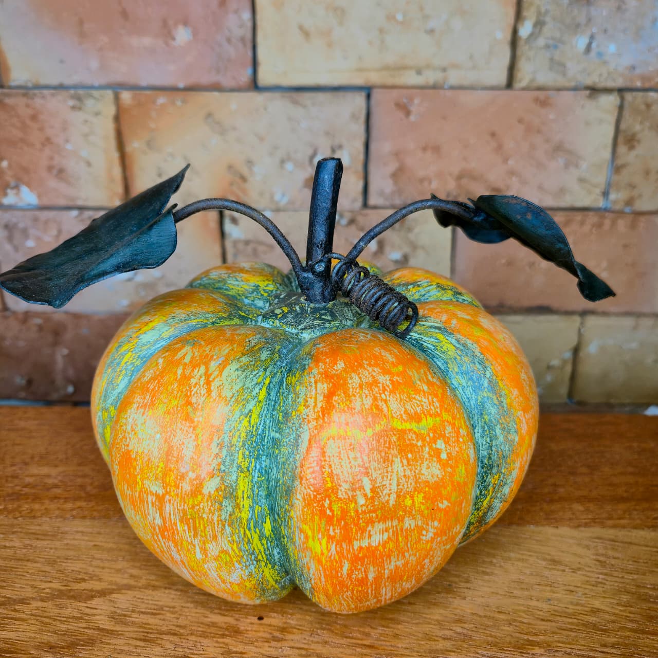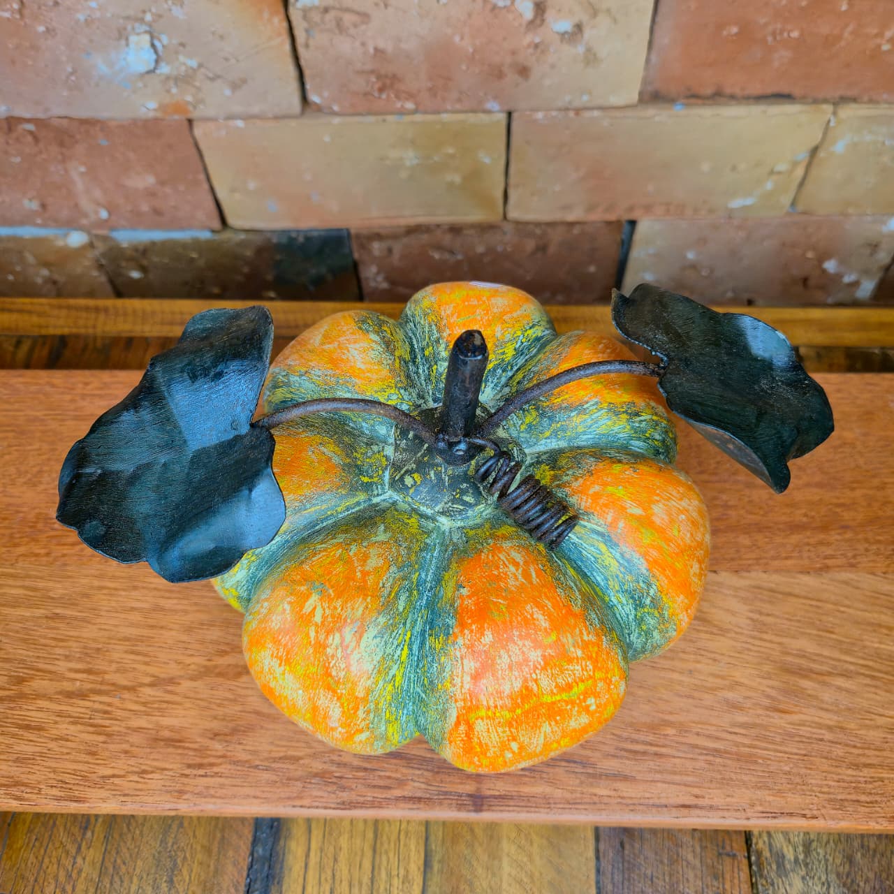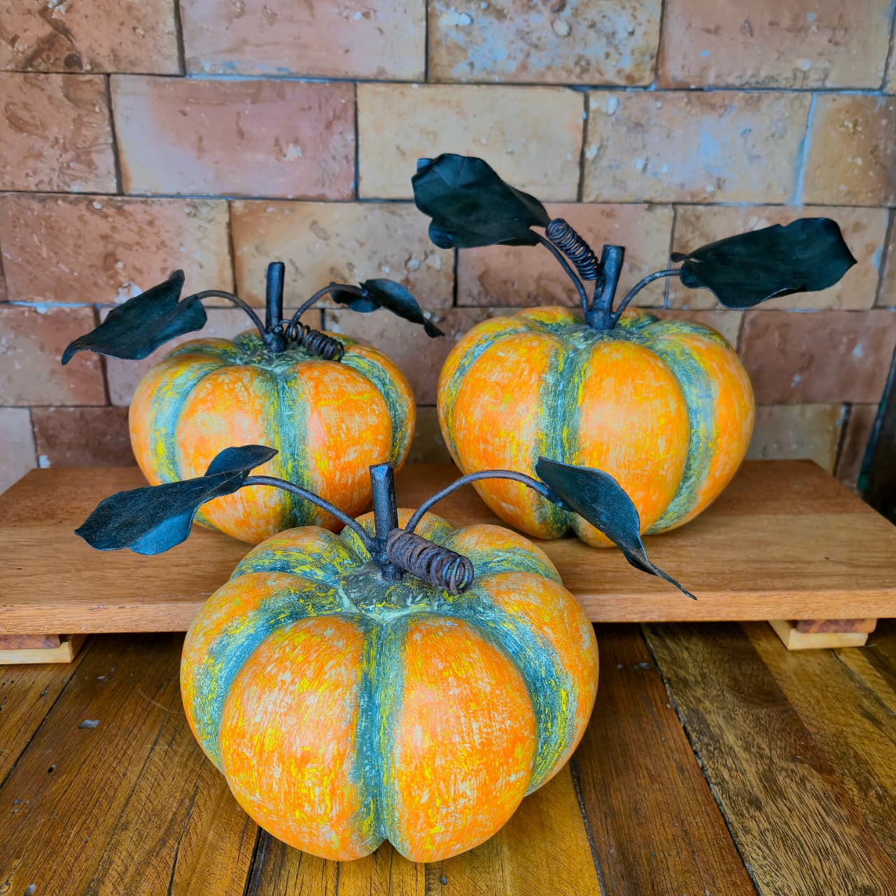 Abóbora decorativa produzida na madeira com Folhas de ferro. Detalhes de pintura artesanal.