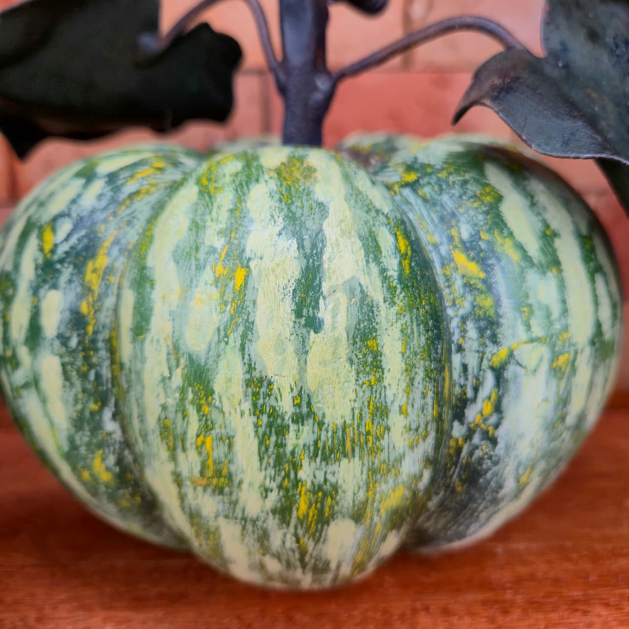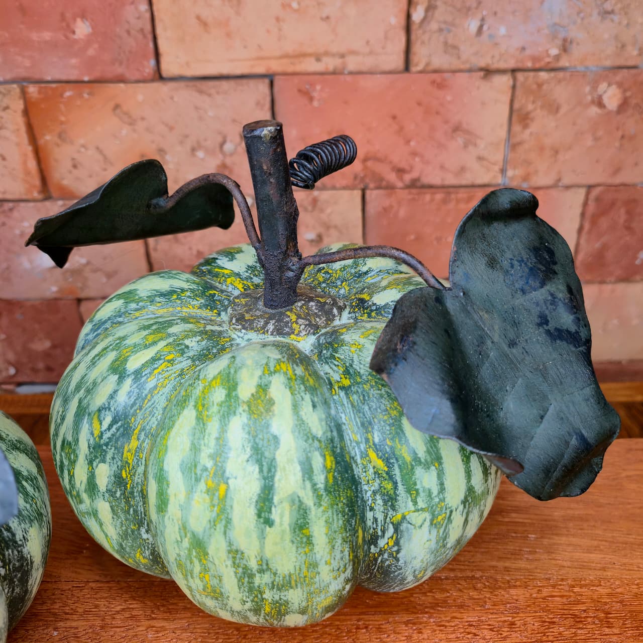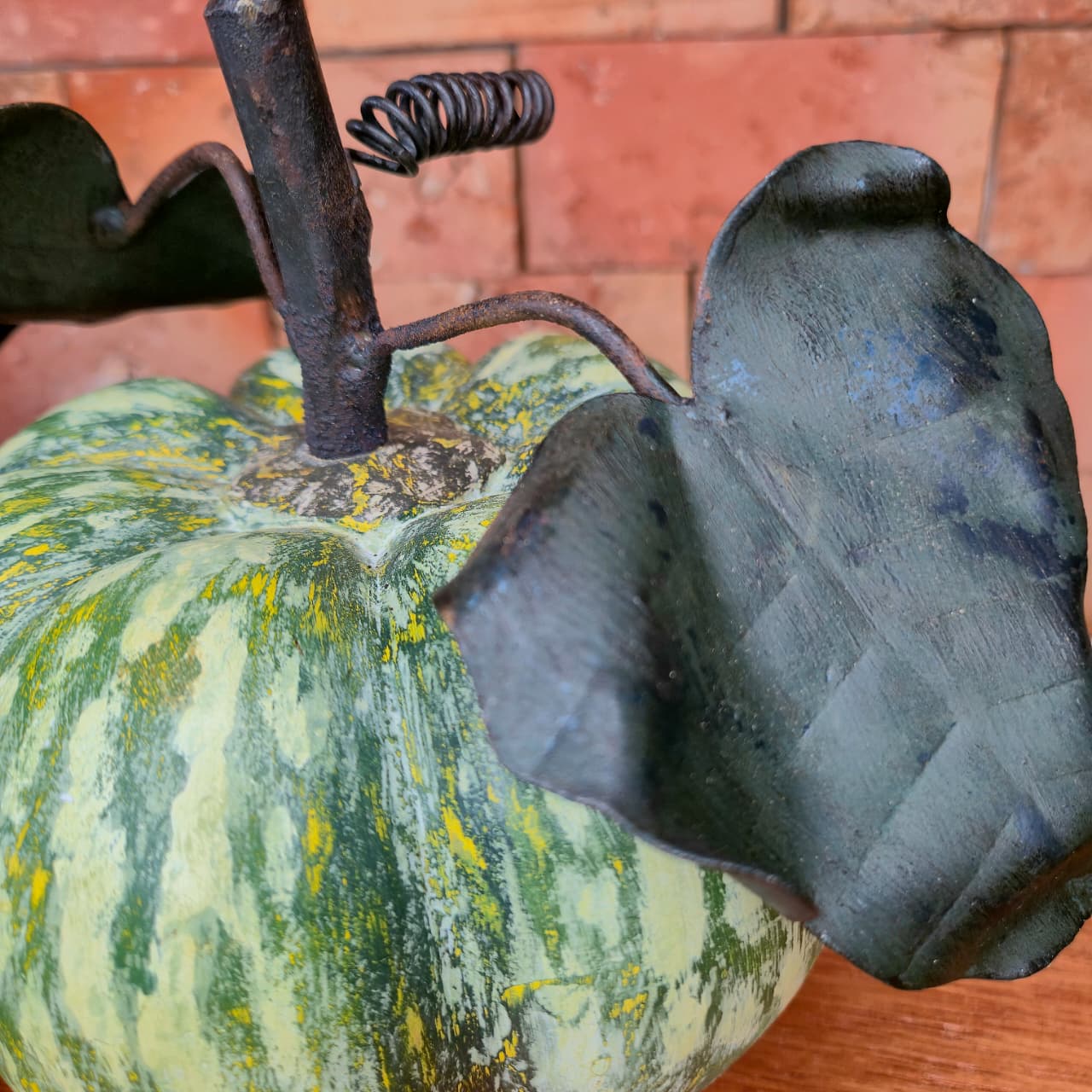 Abóbora decorativa produzida na madeira com Folhas de ferro. Detalhes de pintura artesanal.
