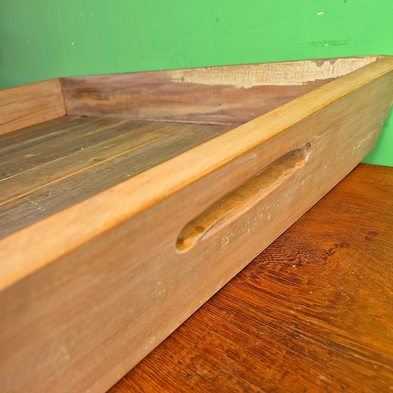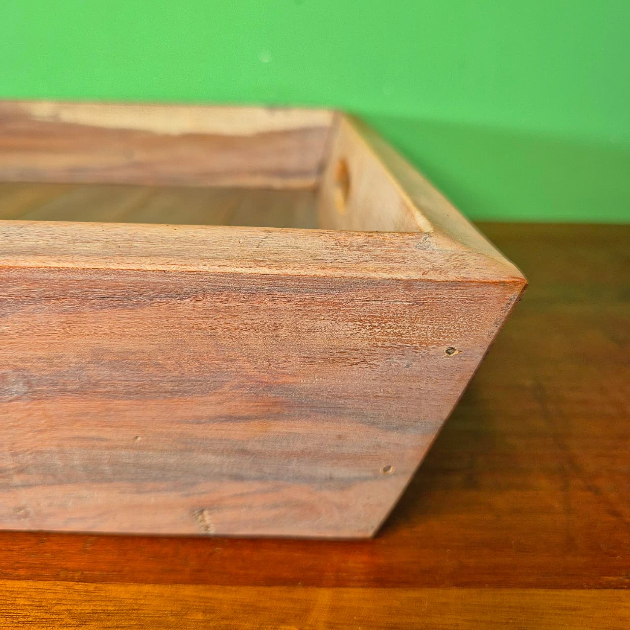 Bandeja produzida em madeira de demolição com alça. Detalhes em branco.
