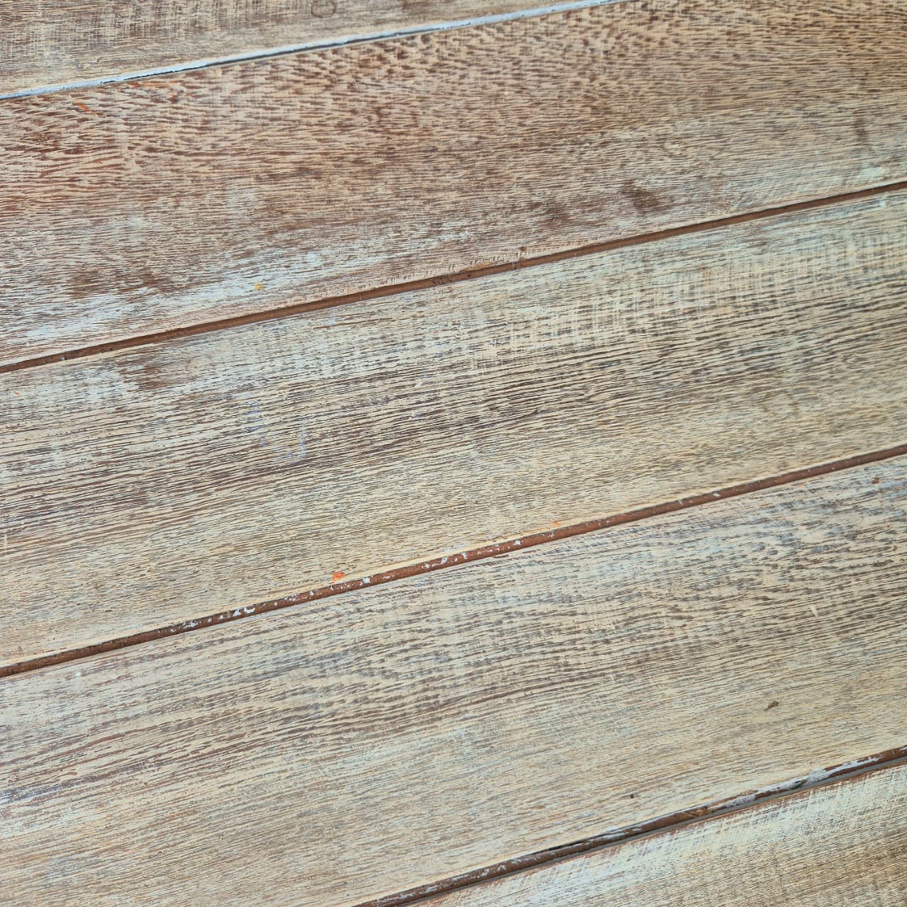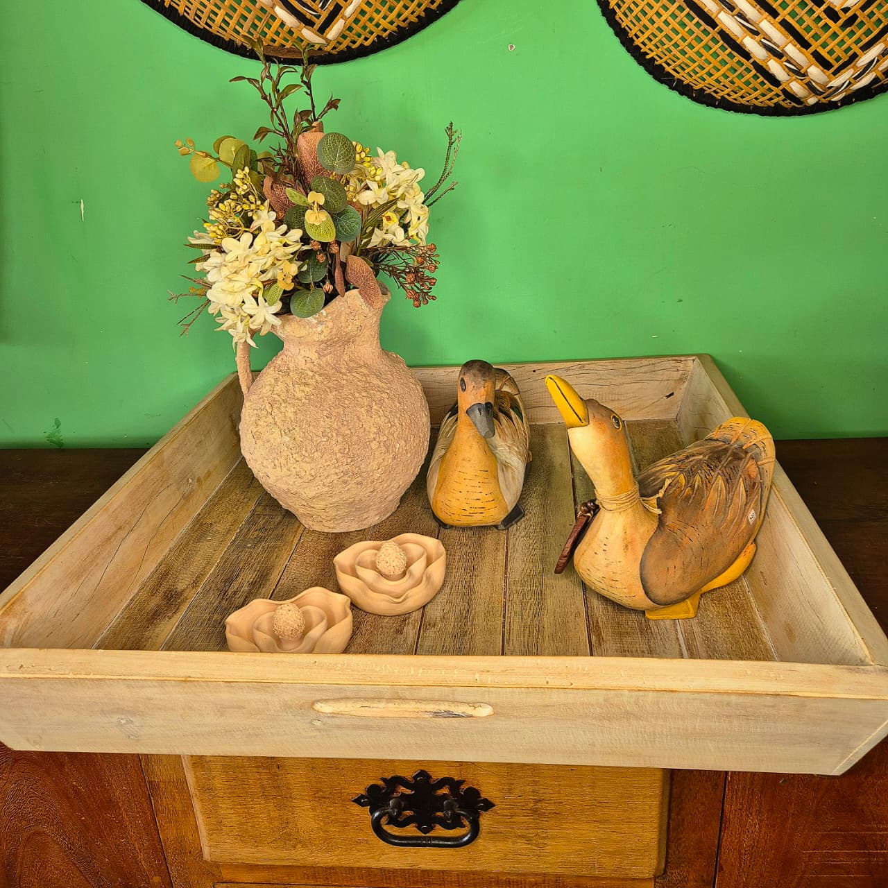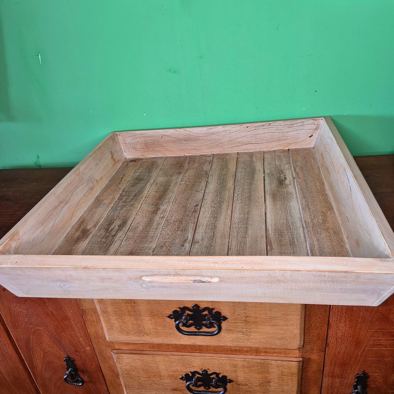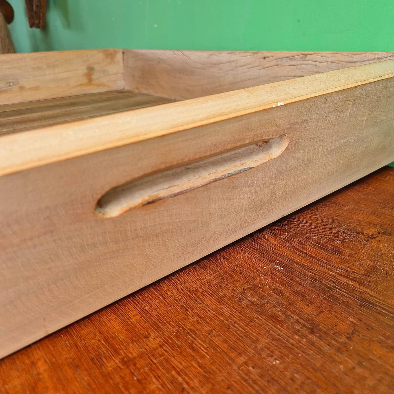 Bandeja produzida em madeira de demolição com alça em todas extremidades. Detalhes em branco.