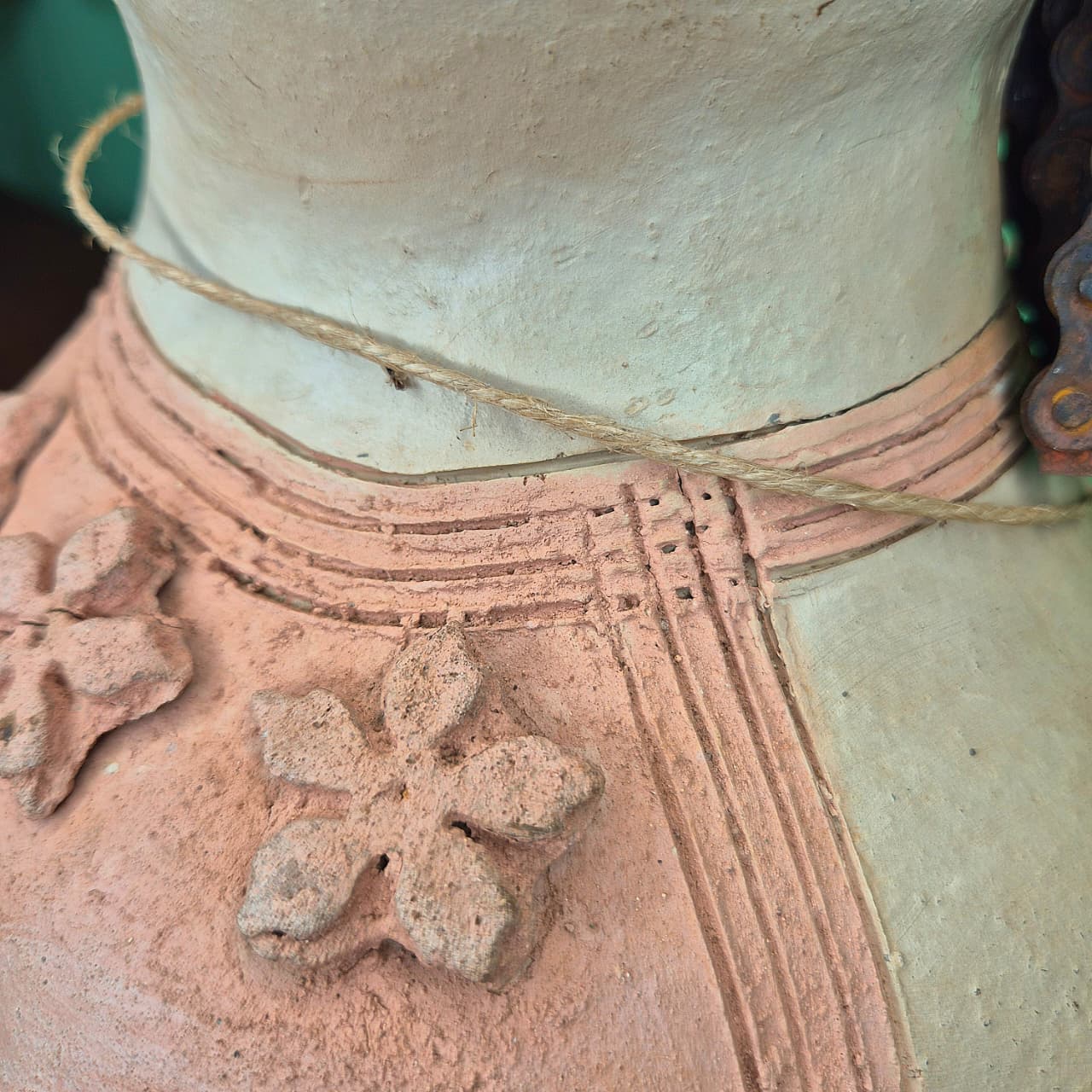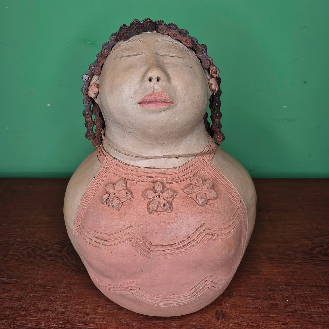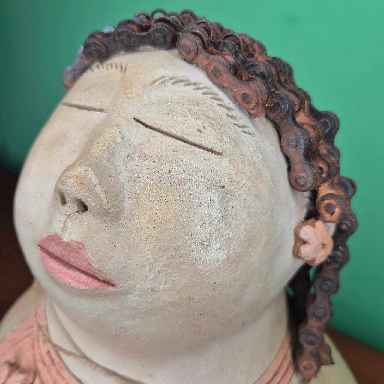 Boneca produzida artesanalmente em cerâmica com detalhes em cabelo de corrente (bicicleta).