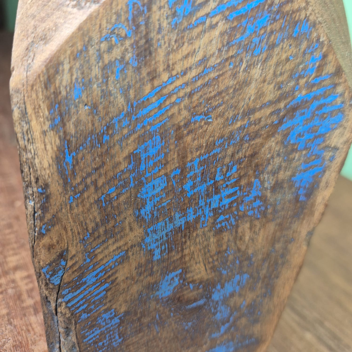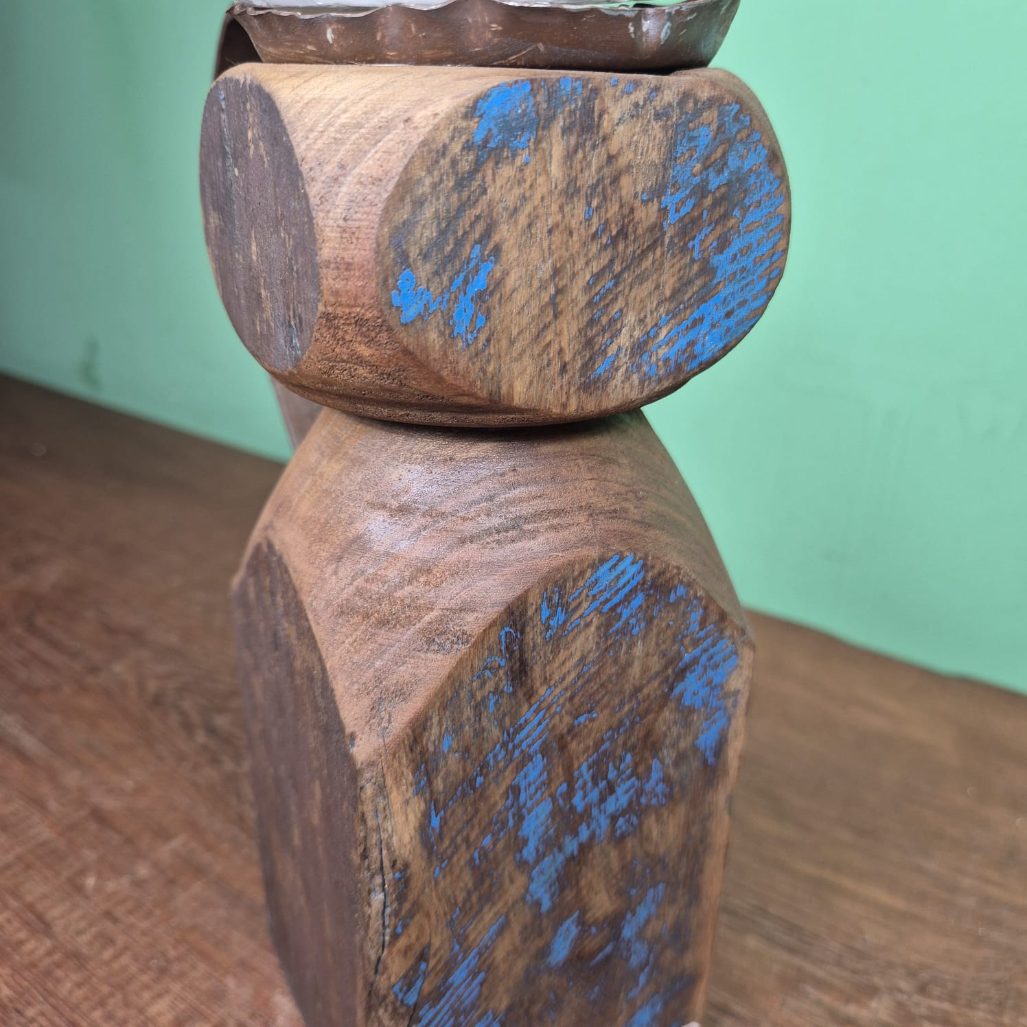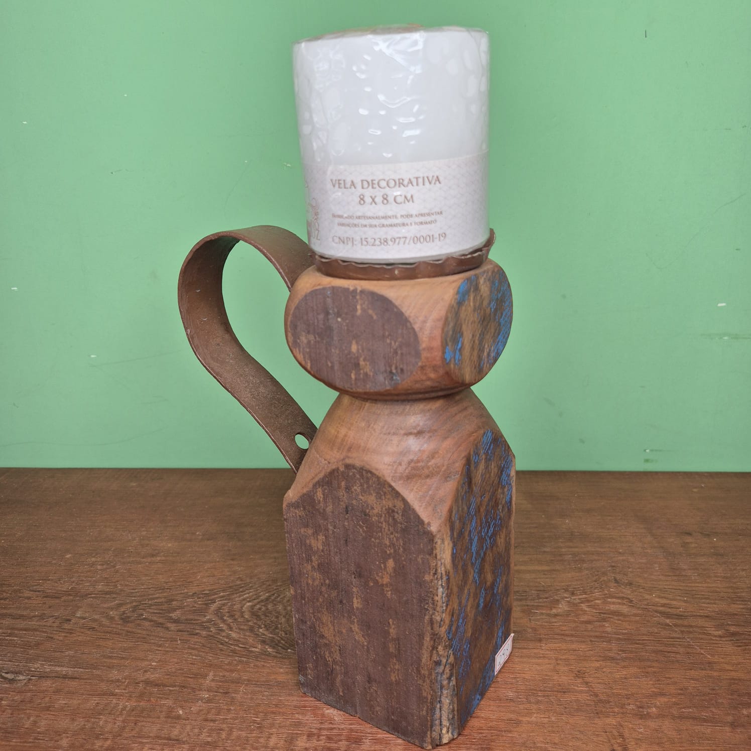 Castiçal produzido em madeira com detalhes na cor azul.
