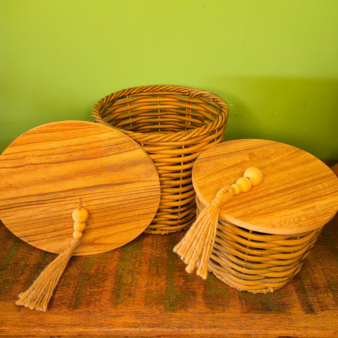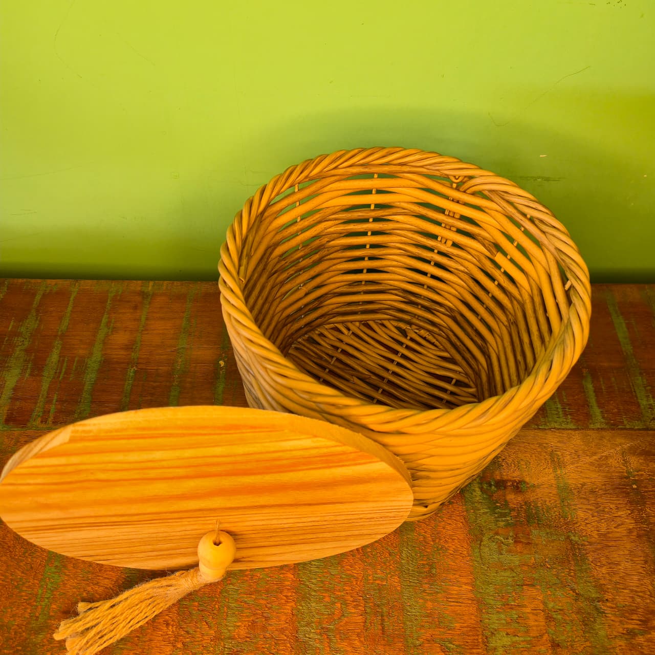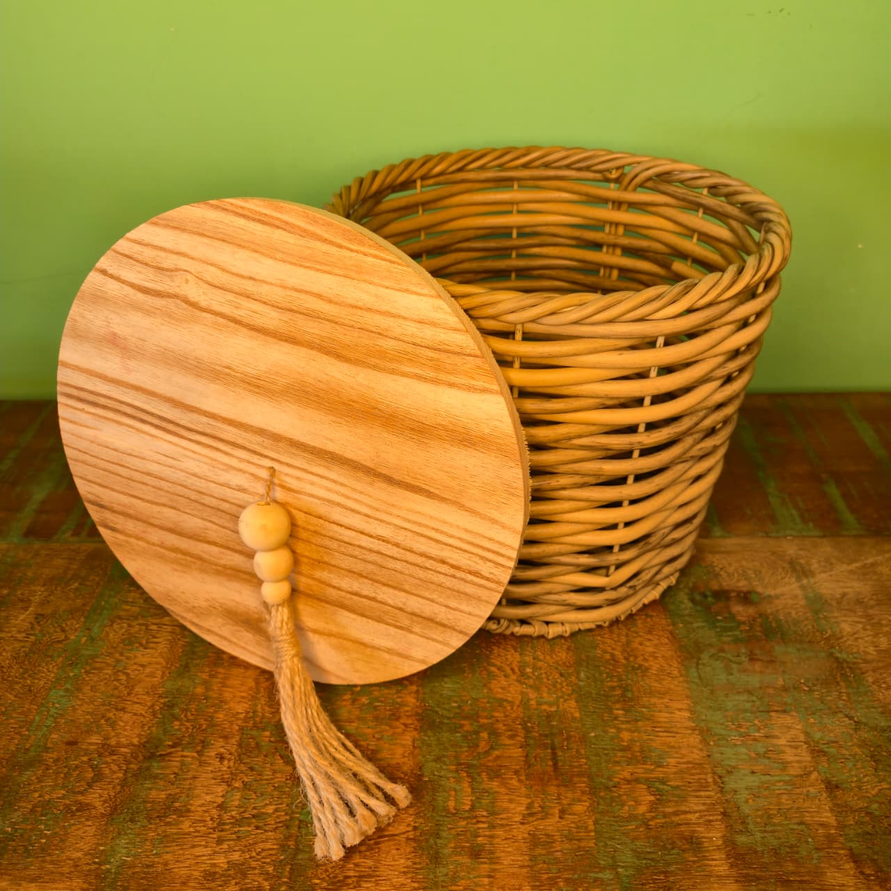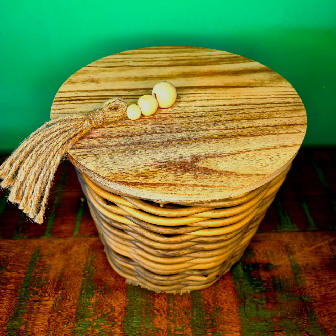 Cesto na Fibra de Rattan Sintética com Tampa de Madeira Revestida em Ferro – M