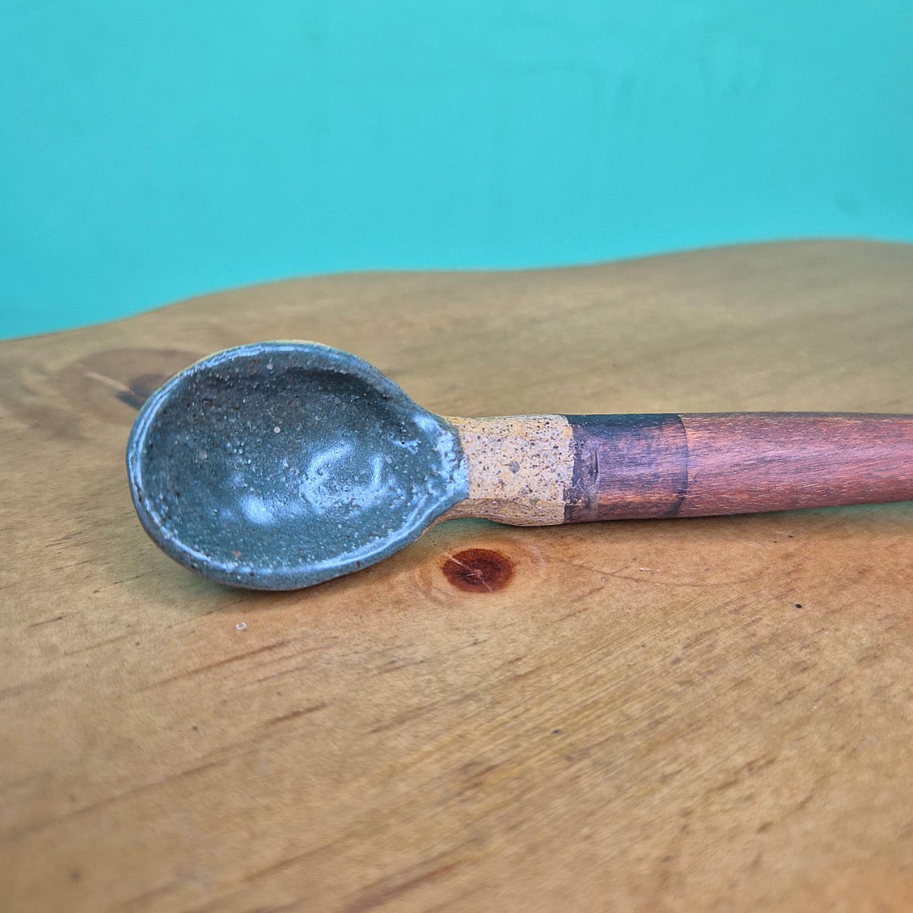Colher em cerâmica produzida artesanalmente com cabo em madeira. Cor verde.