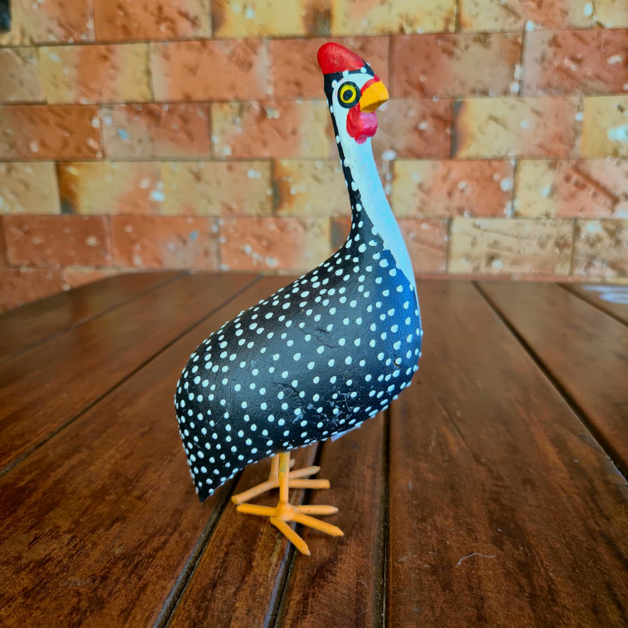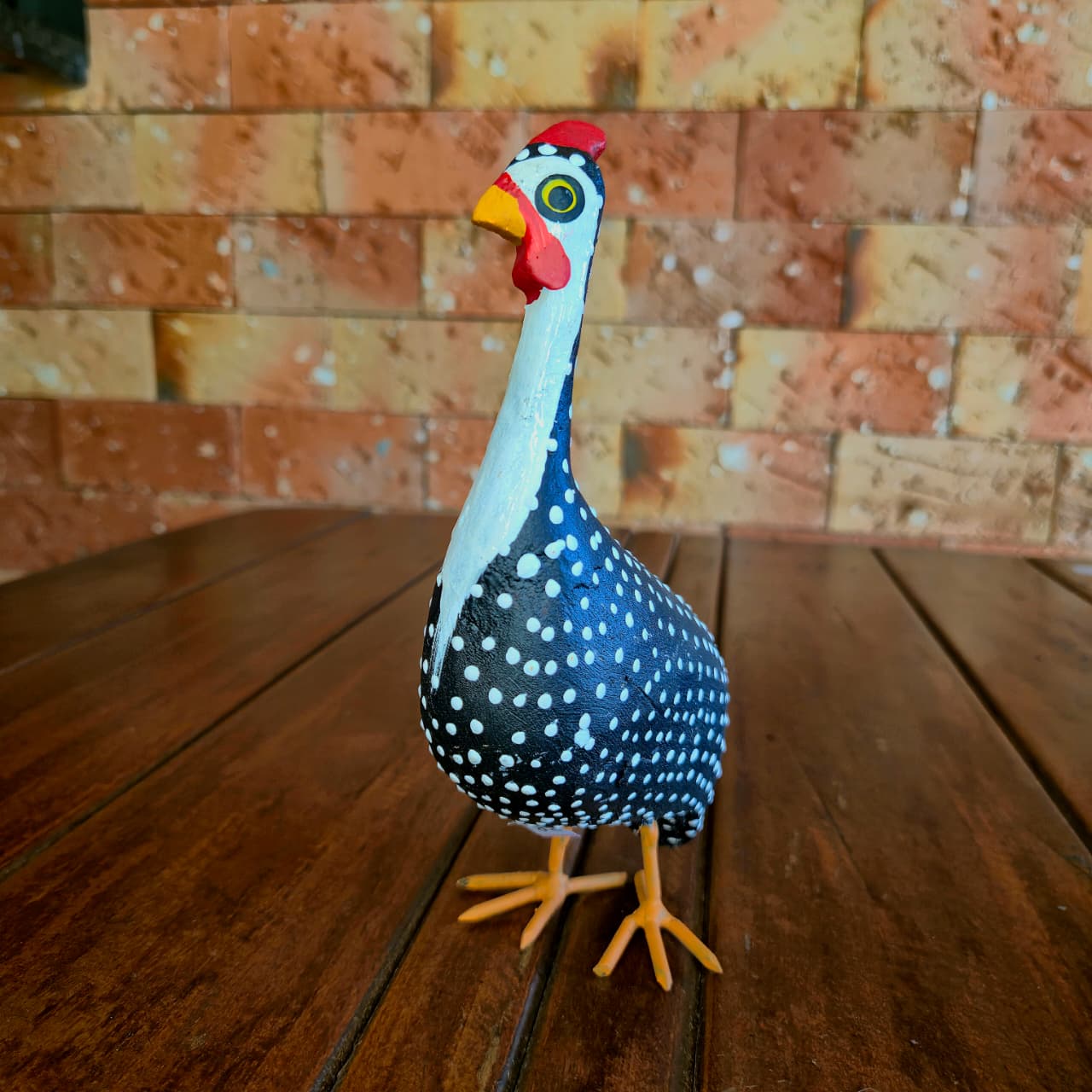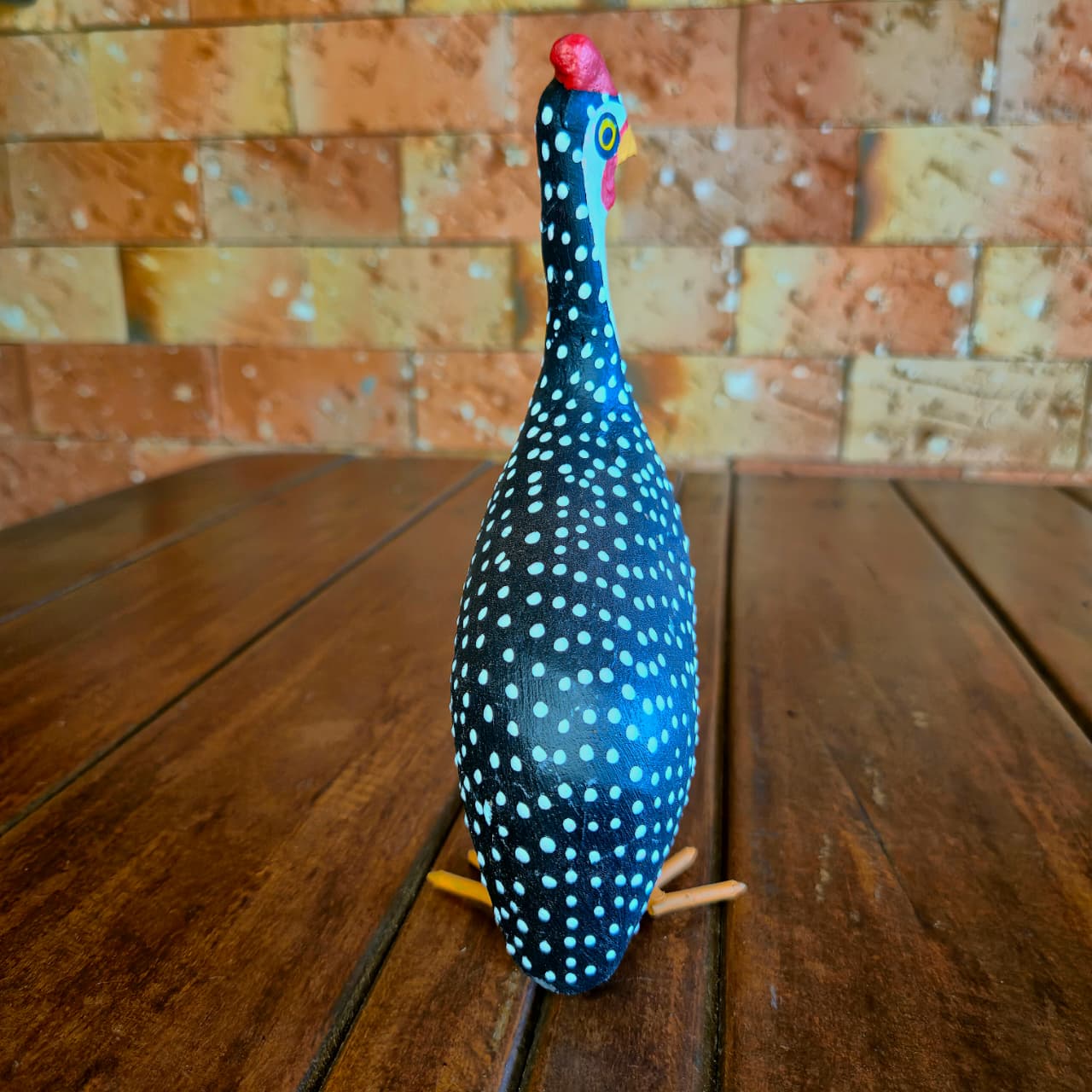 Galinha da angola produzida na madeira com detalhes de pintura artesanal.