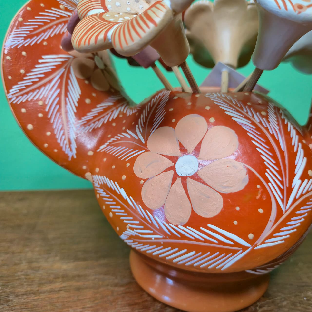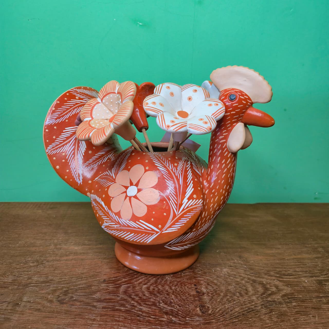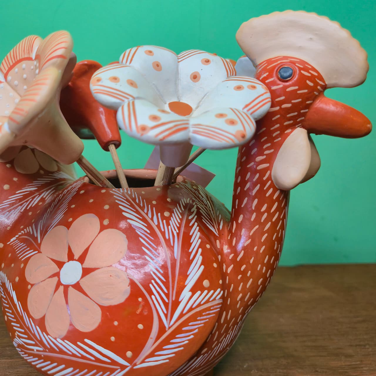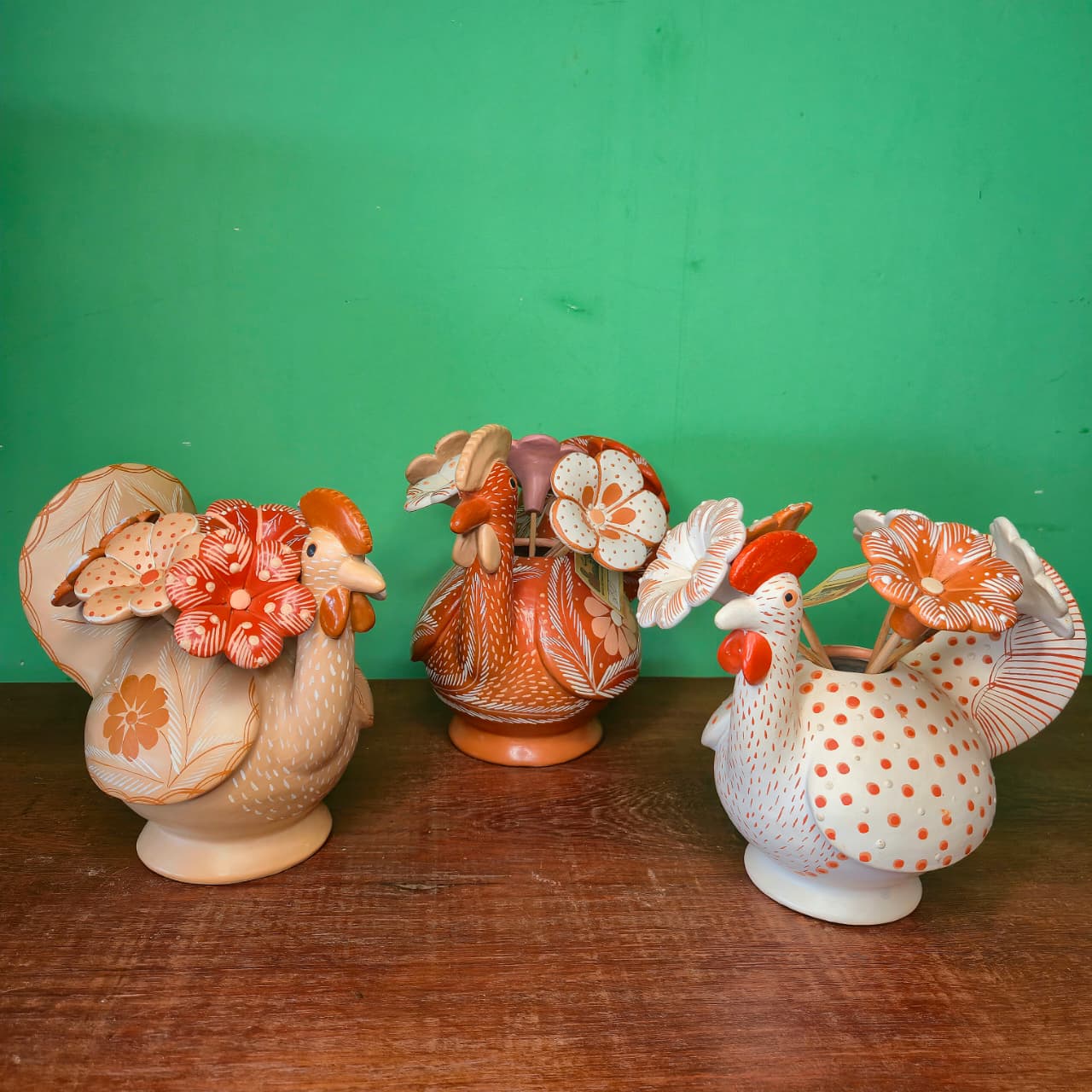 Galinha produzida na cerâmica com pintura artesanal variável. Acompanha 6 flores.