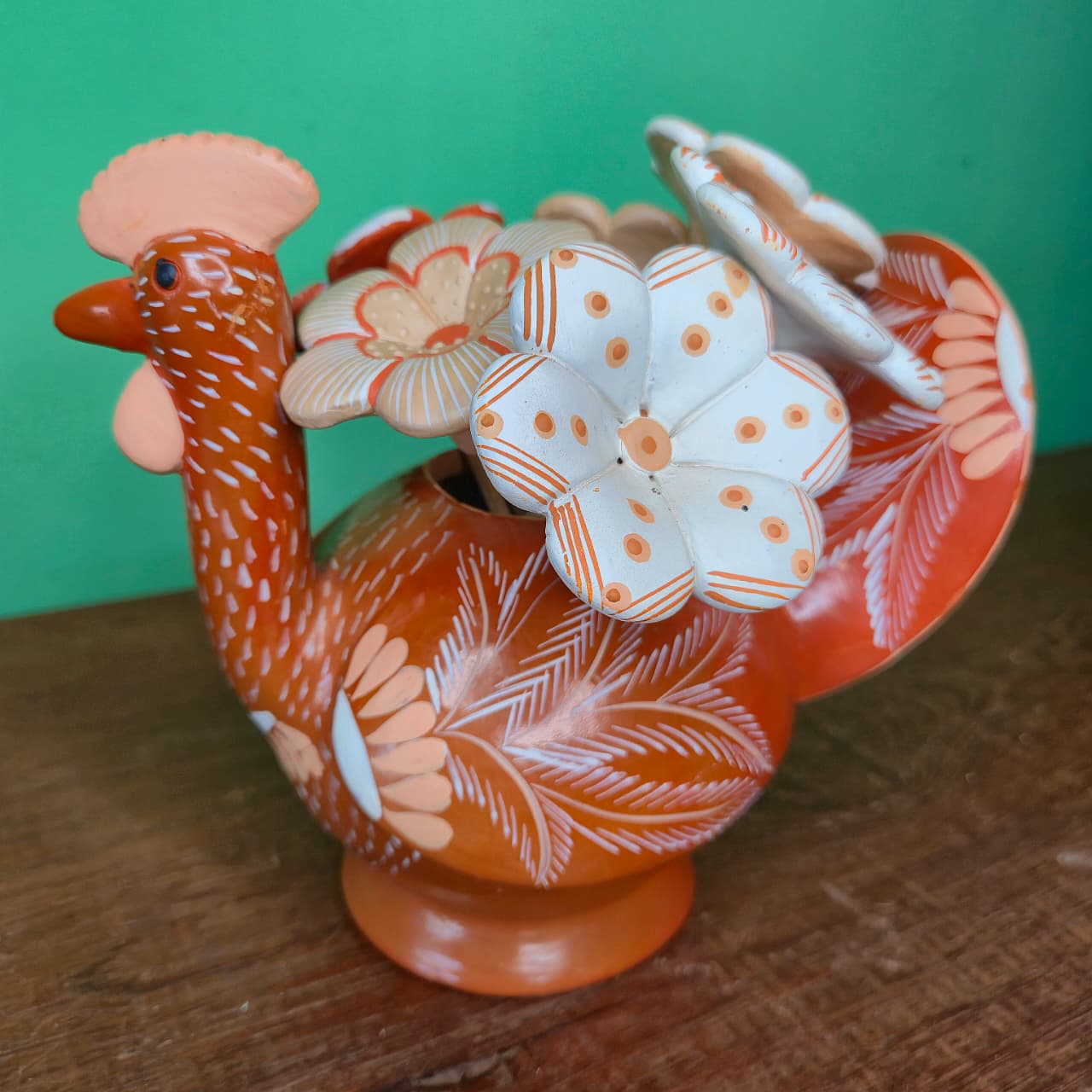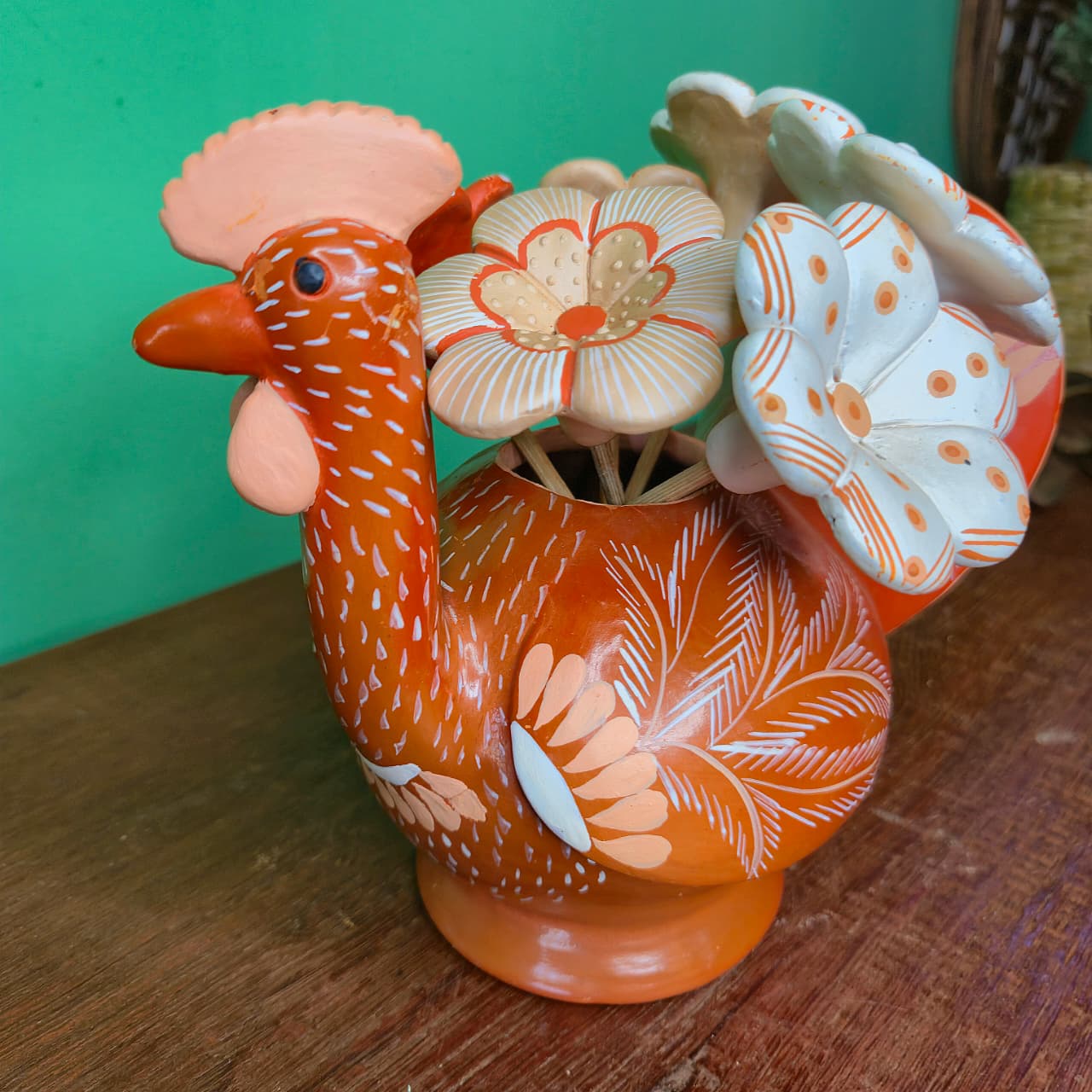 Galinha produzida na cerâmica com pintura artesanal variável. Acompanha 6 flores.