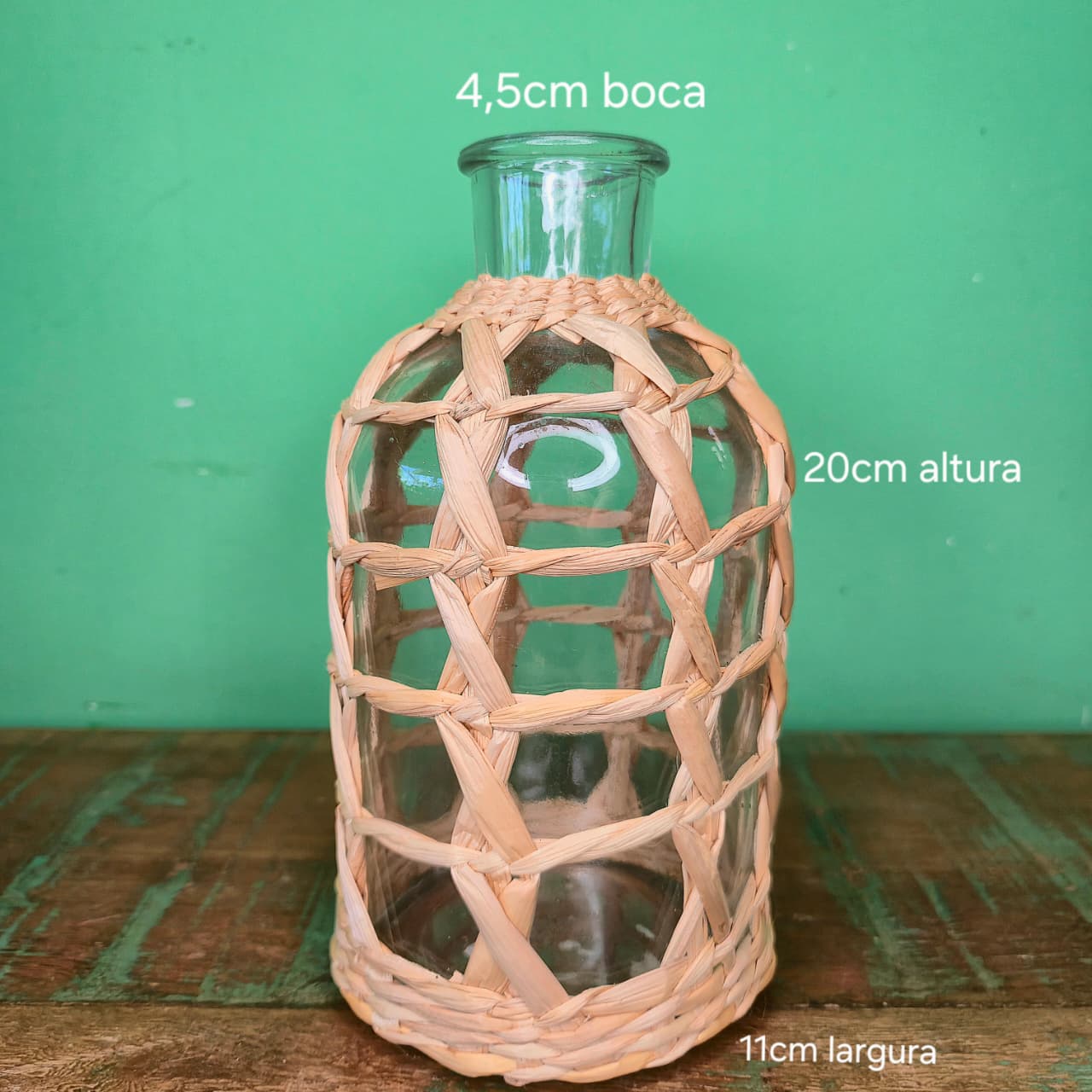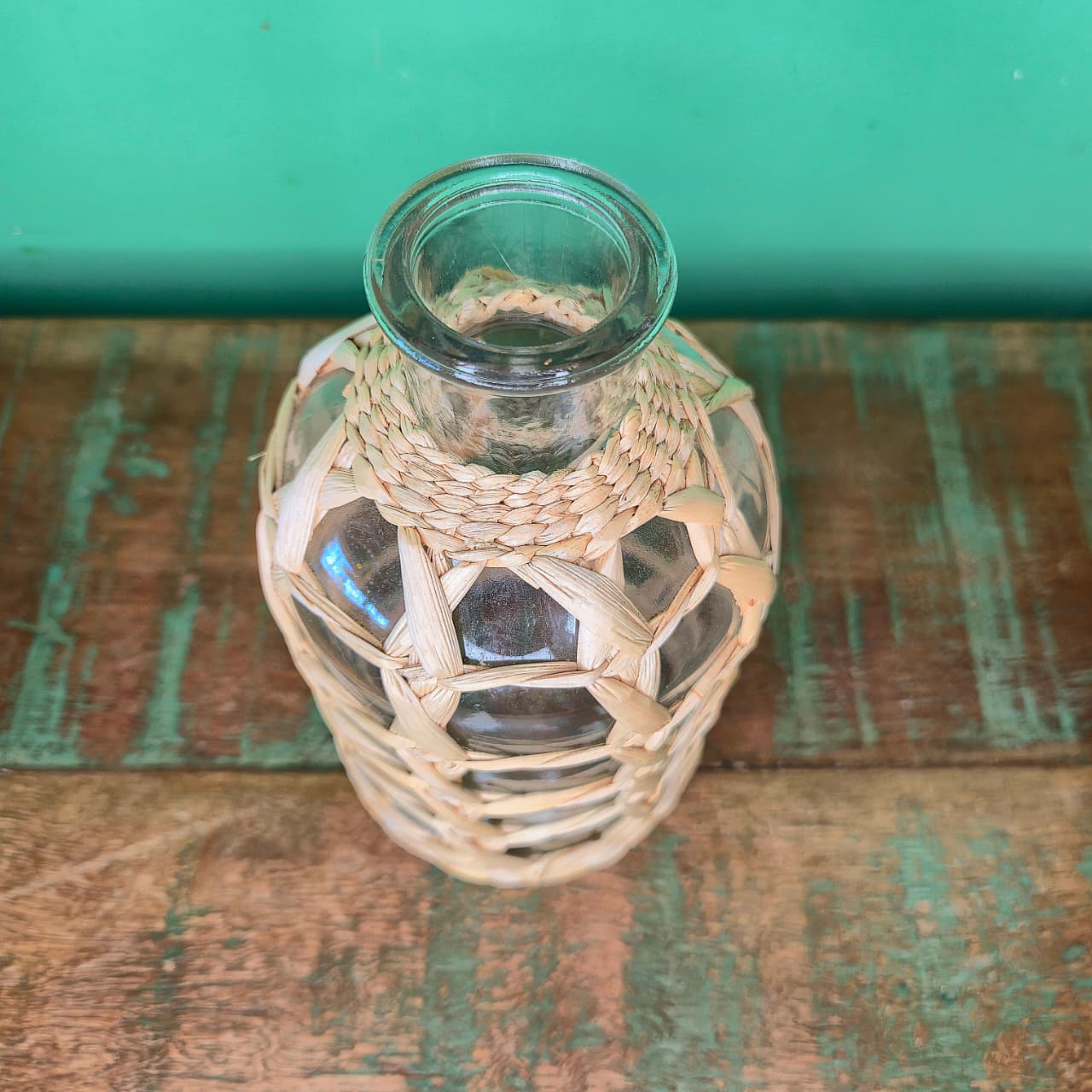 Garrafa em vidro com trabalho artesanal produzido na fibra de taboa.
