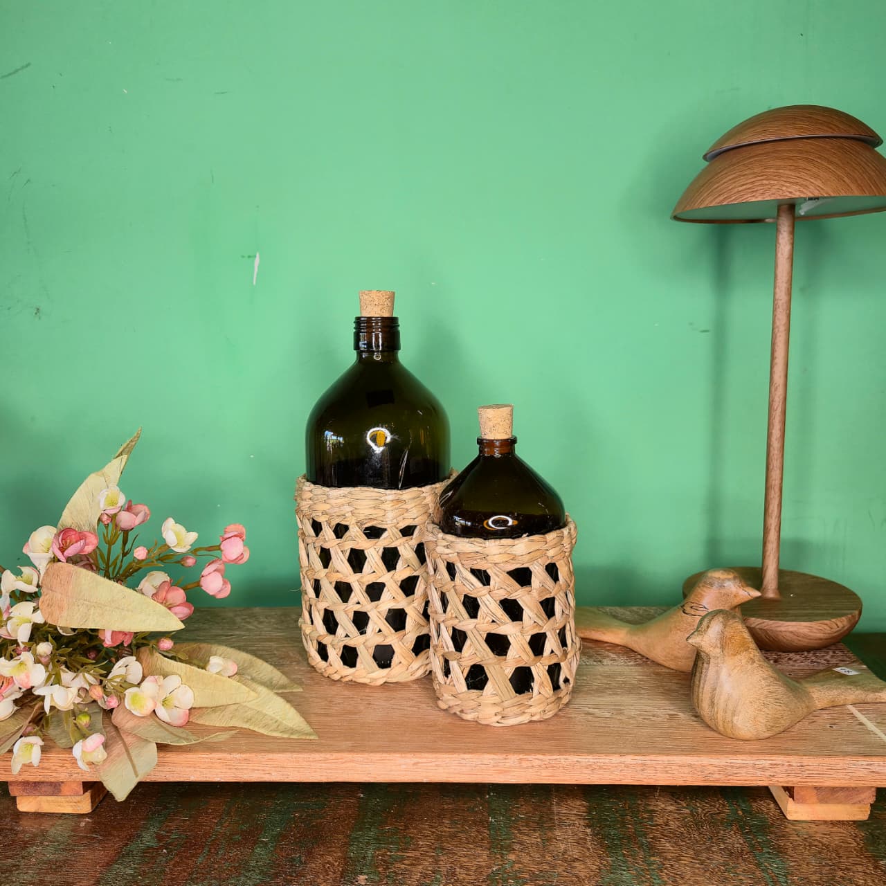 Garrafão em vidro âmbar revestido com trabalho artesanal produzido na fibra de taboa.