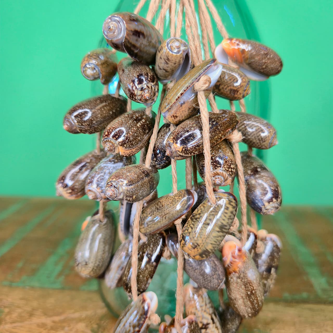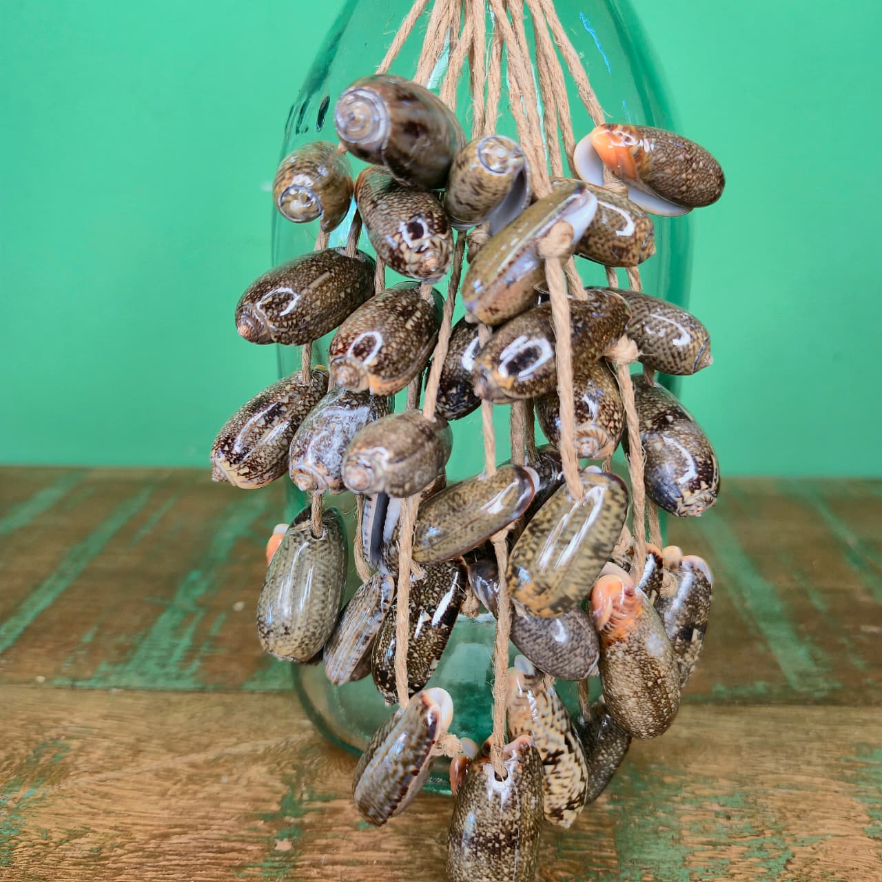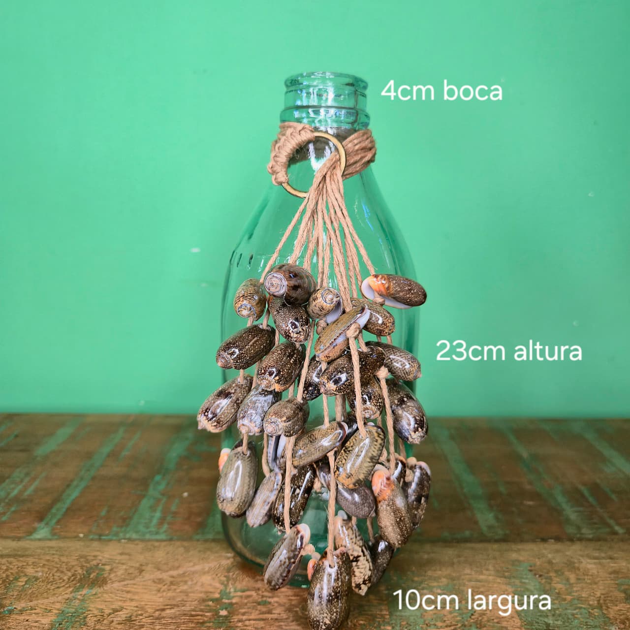 Garrafinha de vidro com trabalho artesanal de colar de conchas.