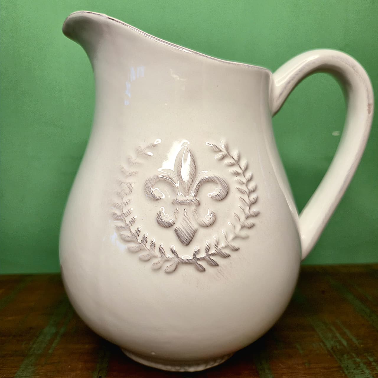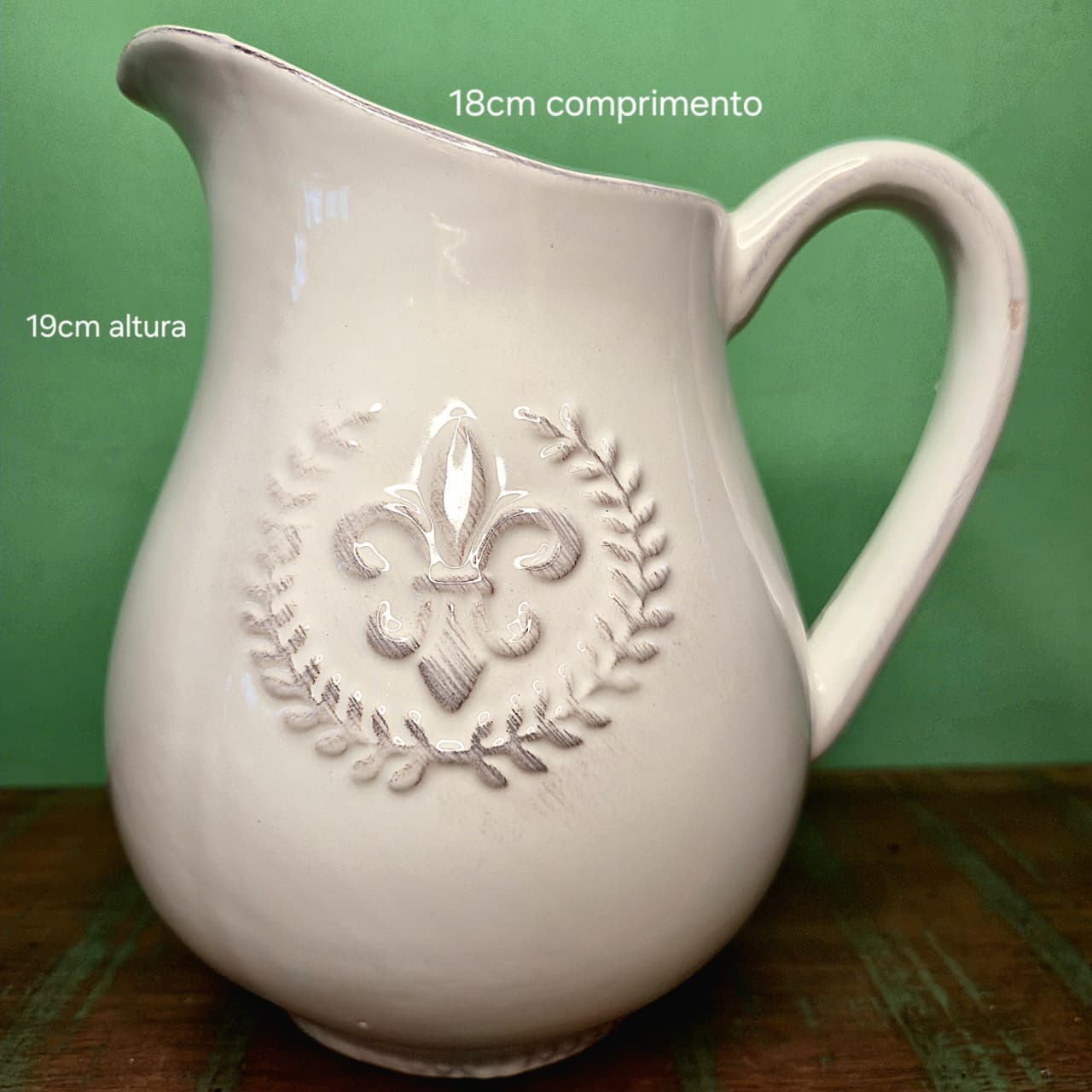 Jarra no modelo farm house em cerâmica esmaltada com detalhe em flor de liz. Pode ser utilizada como item de cozinha, para compor arranjos florais ou como peça decorativa em mesas e aparadores.