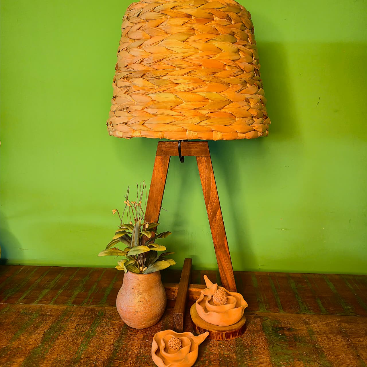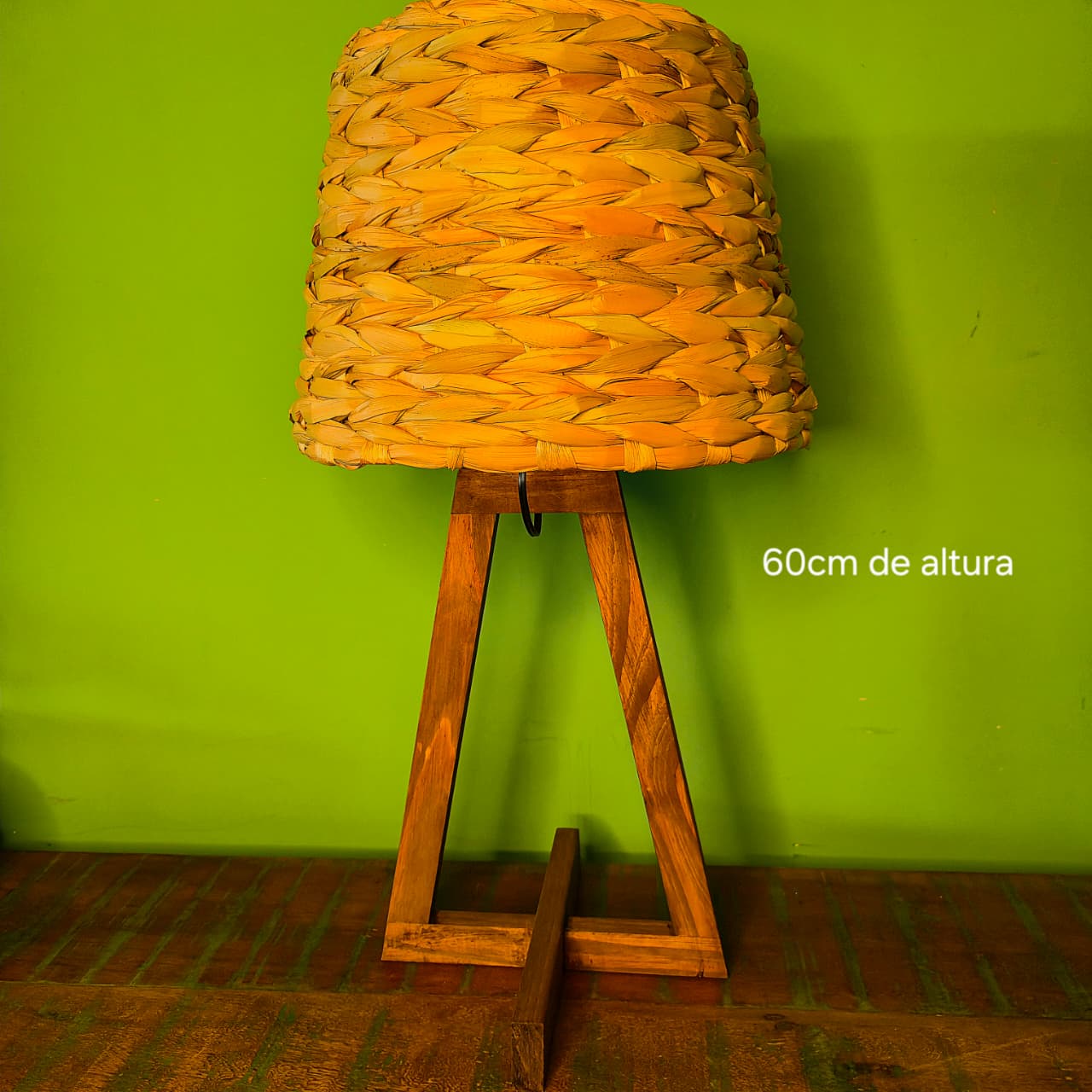 Abajur artesanal trançada a mão produzida na madeira e fibra natural de taboa.
