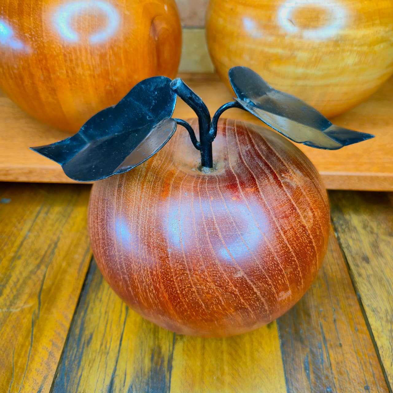 Maçã decorativa produzida na madeira com Folhas de ferro. Detalhes de pintura artesanal.