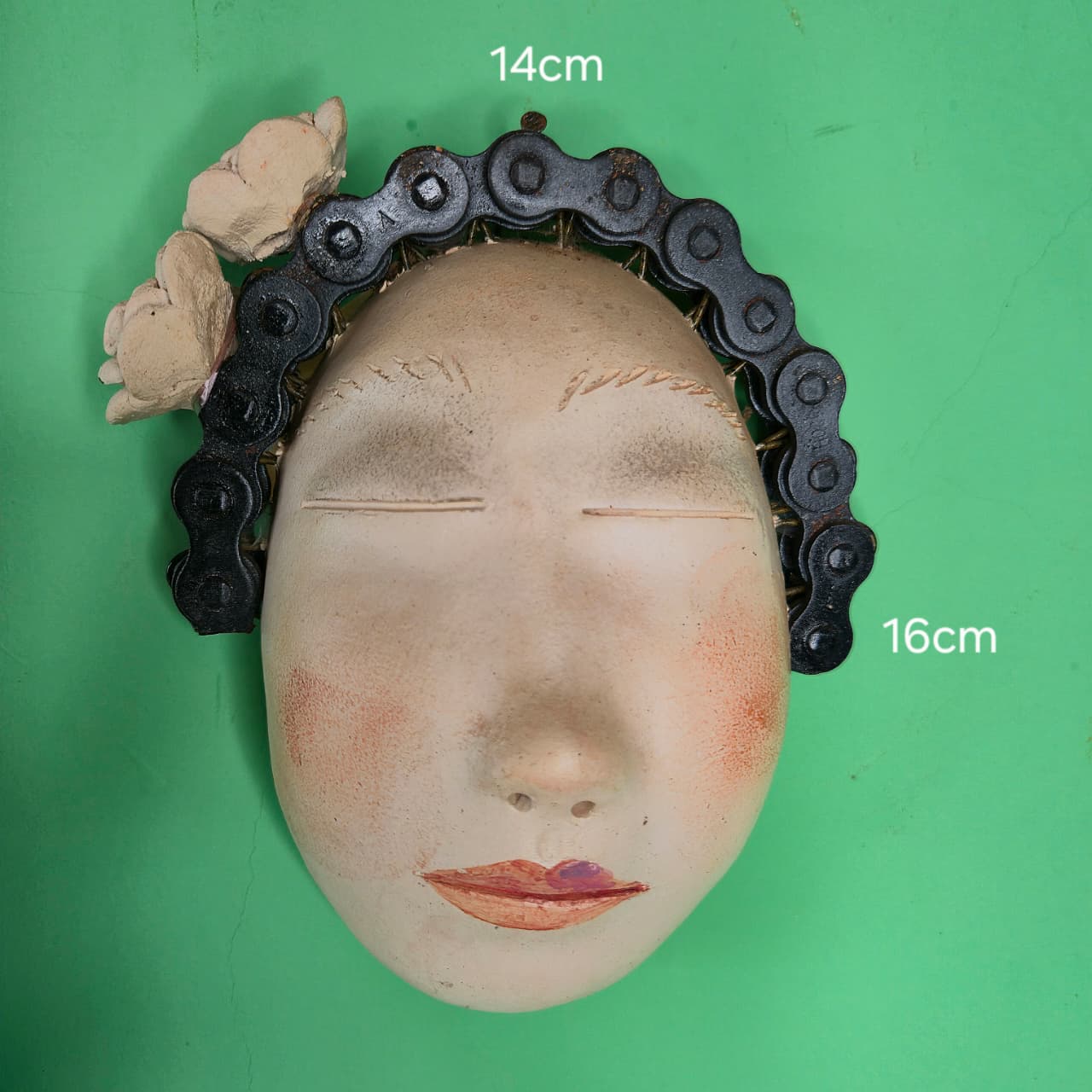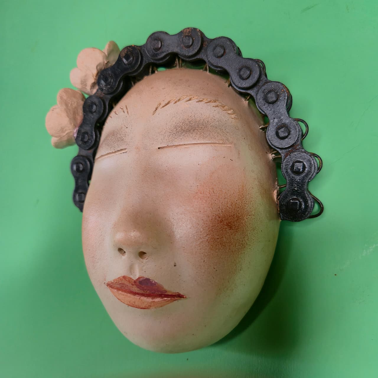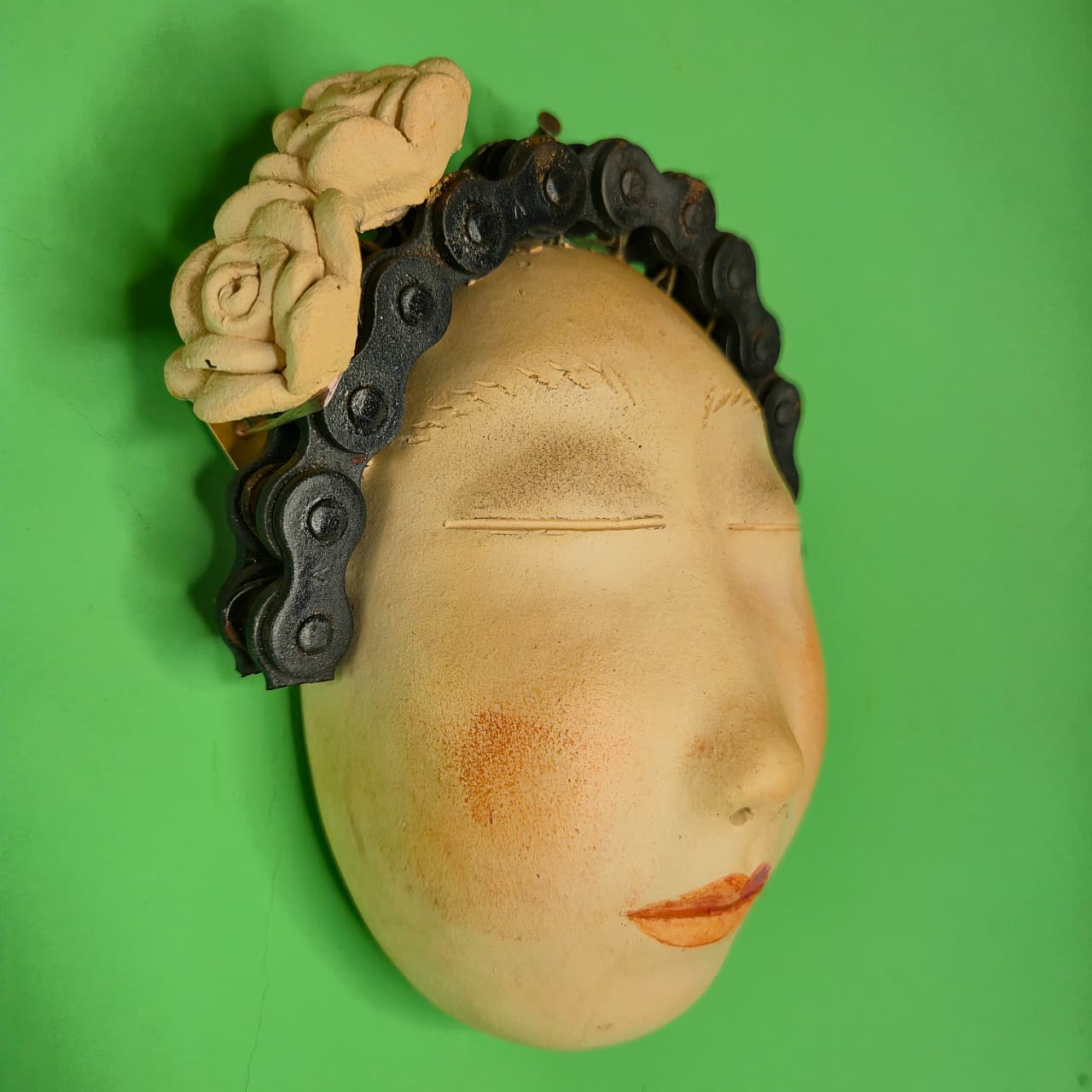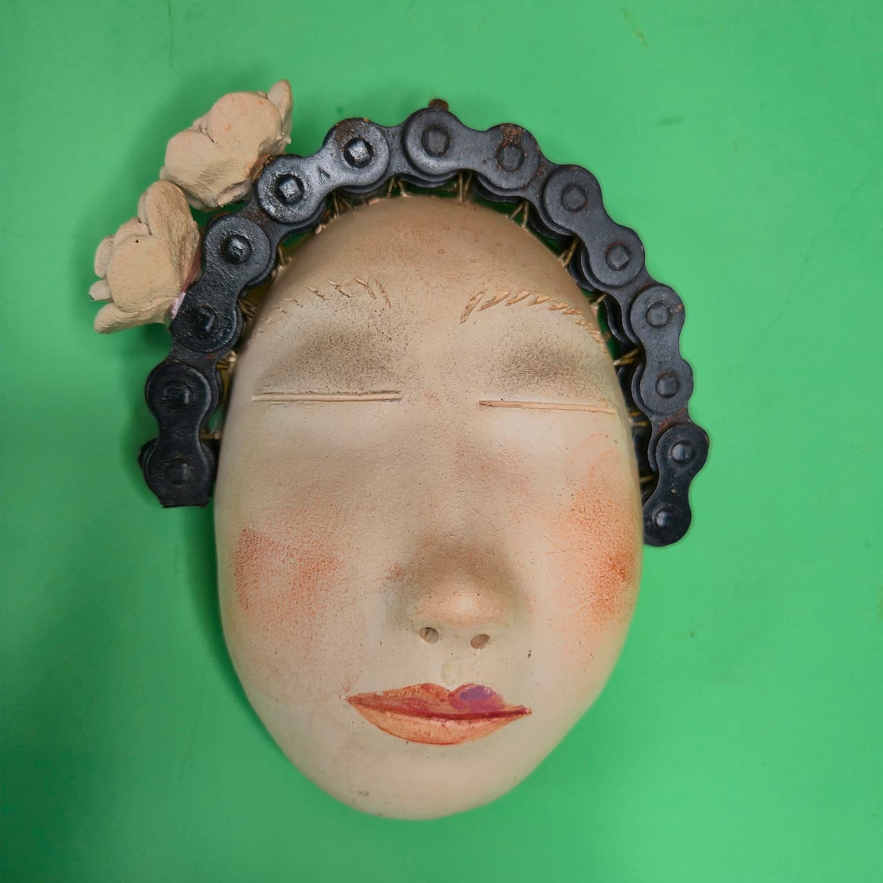 Máscara decorativa produzida na cerâmica com detalhes em ferro. Produto 100% artesanal original Nené Cavalcanti.