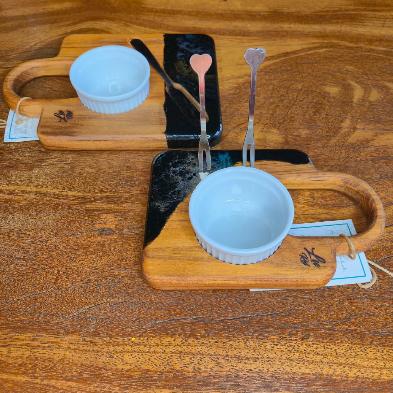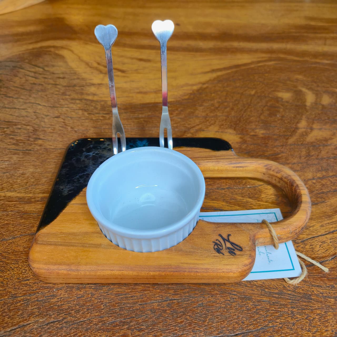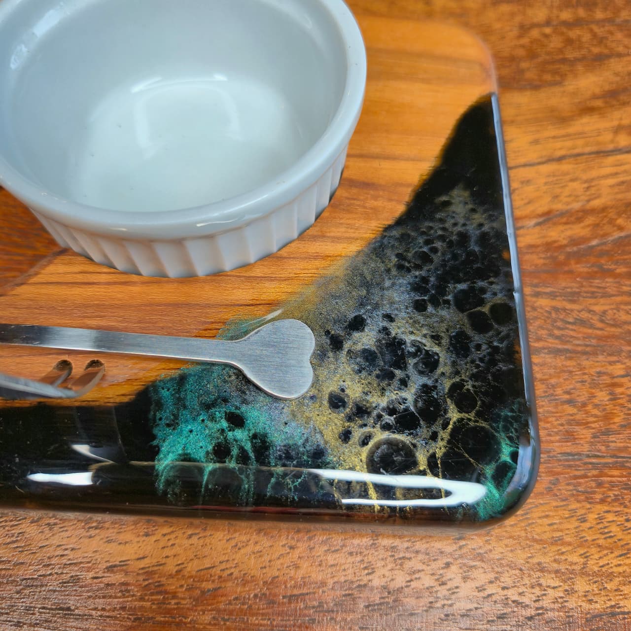 Tábua produzida na madeira teca com trabalho artesanal em resina e acabamento em óleo mineral e cera de abelha.