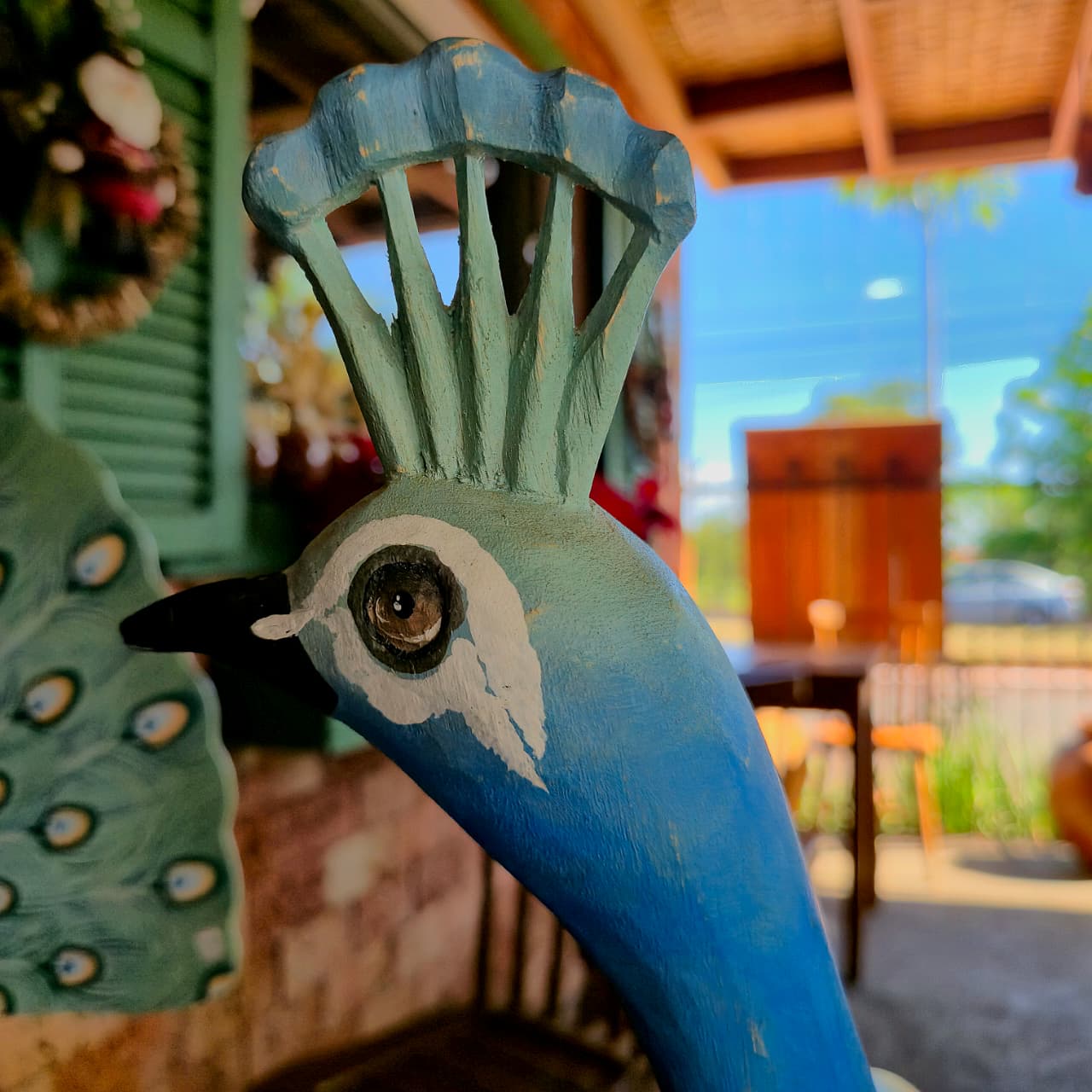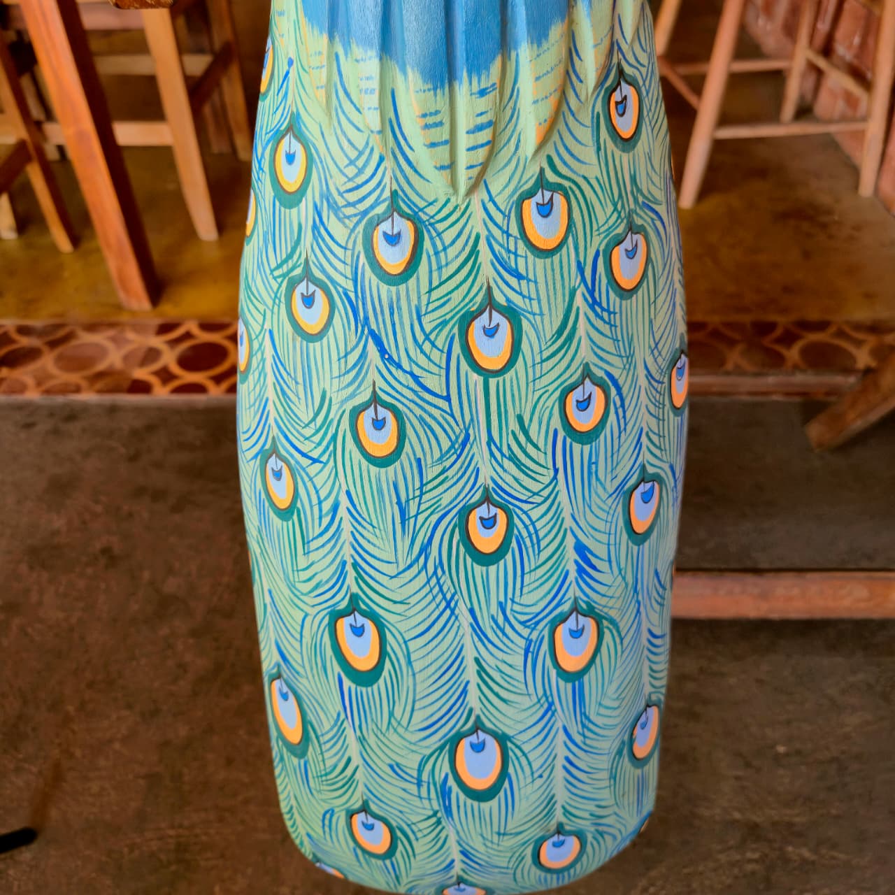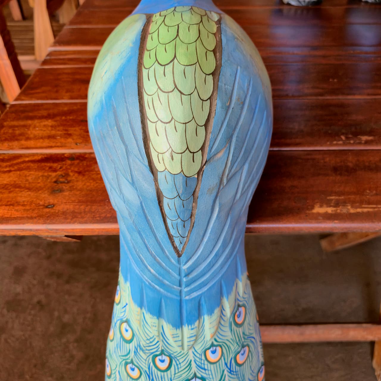 Pavão produzido na madeira com detalhes de pintura artesanal.
