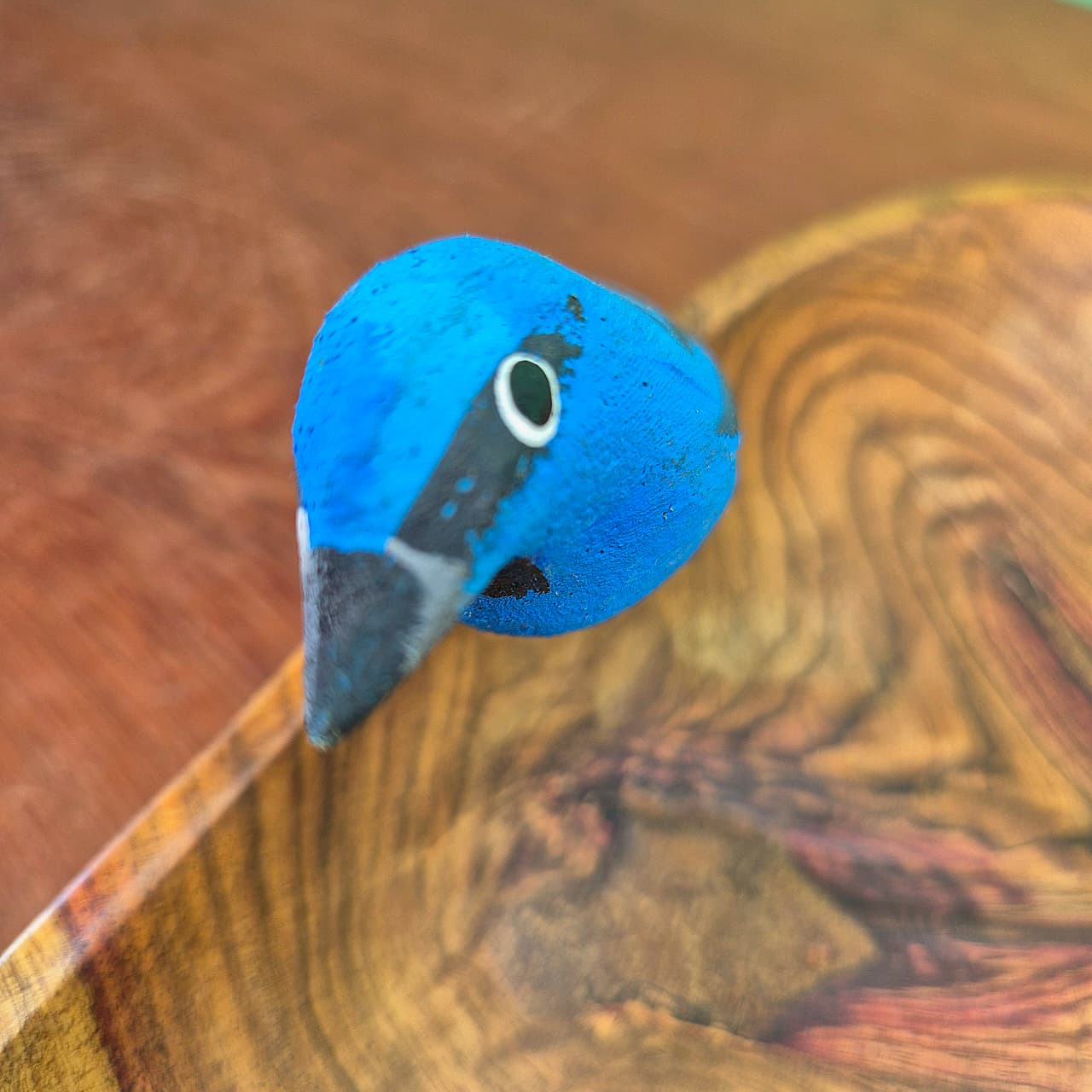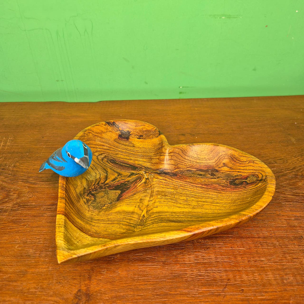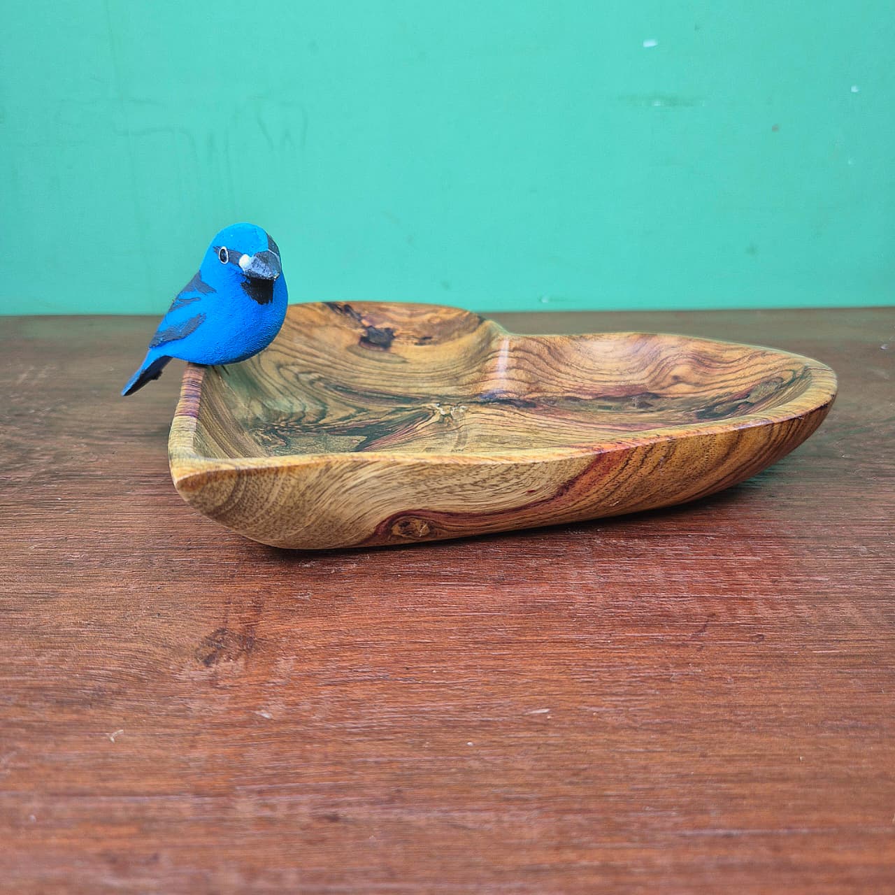 Petisqueira produzida artesanalmente em formato de coração com detalhe em pássaro azul.
