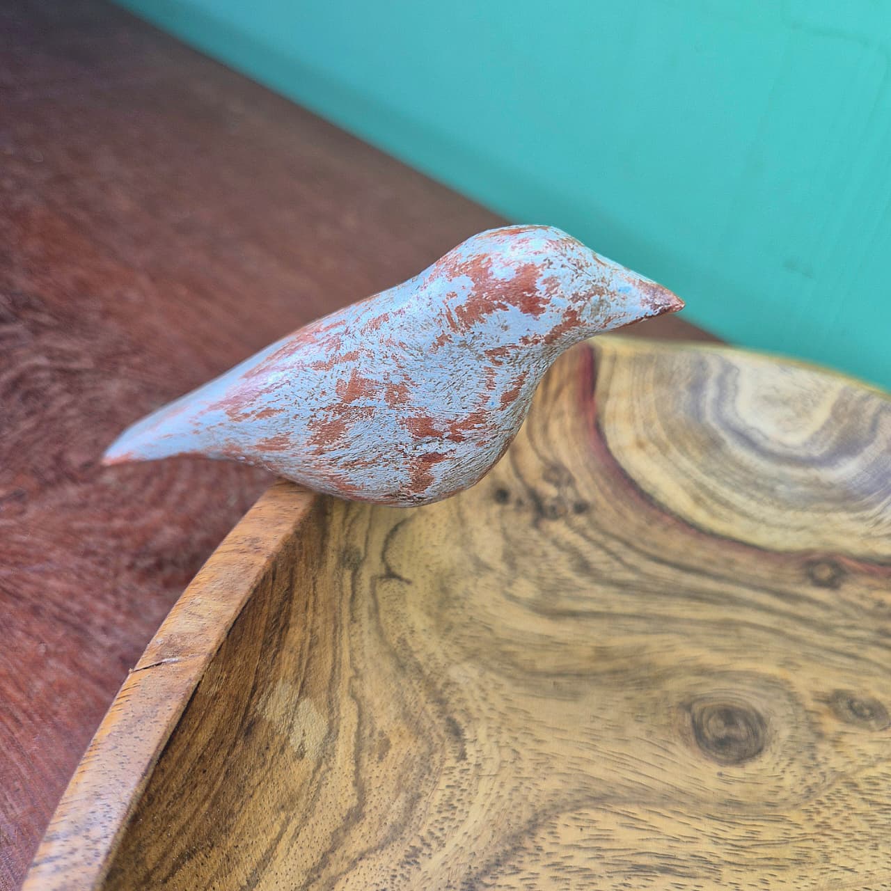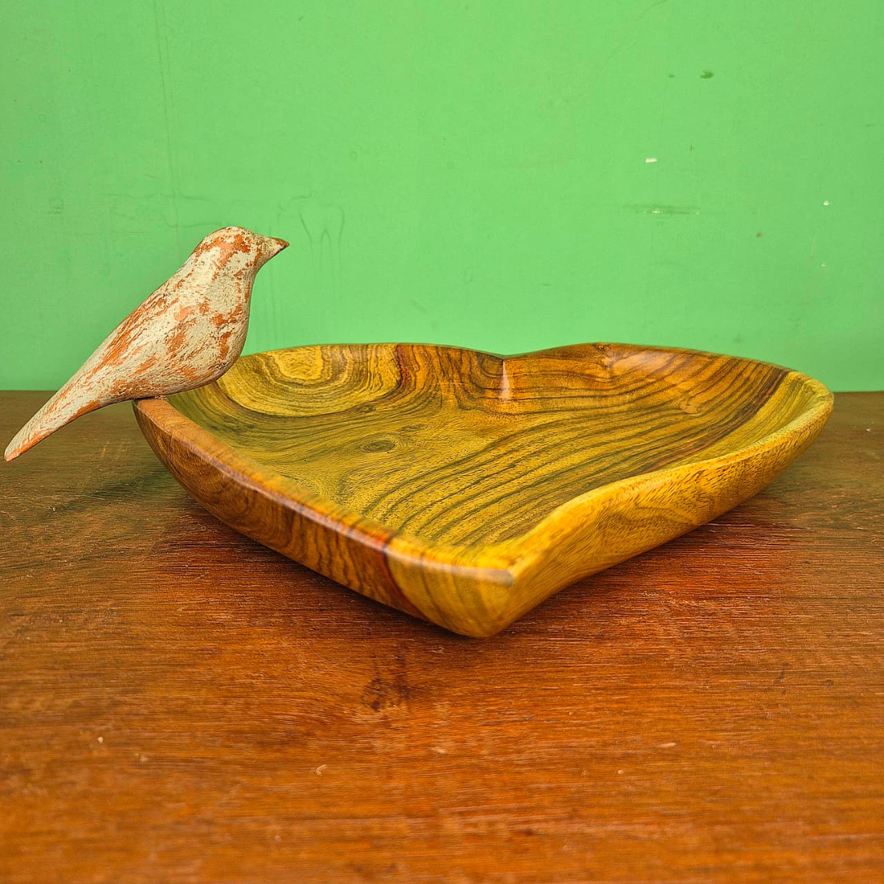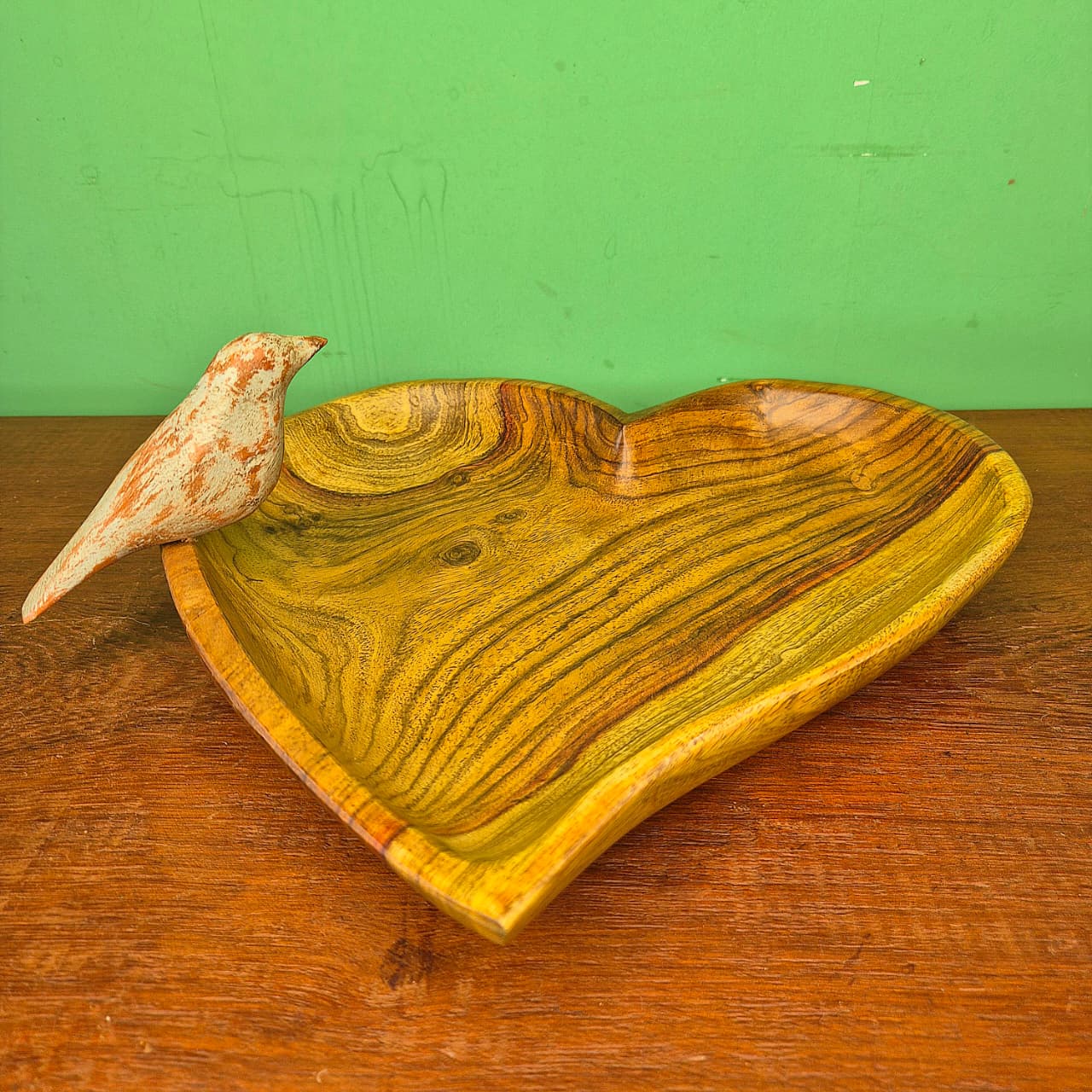 Petisqueira produzida artesanalmente em formato de coração com detalhe de pássaro.