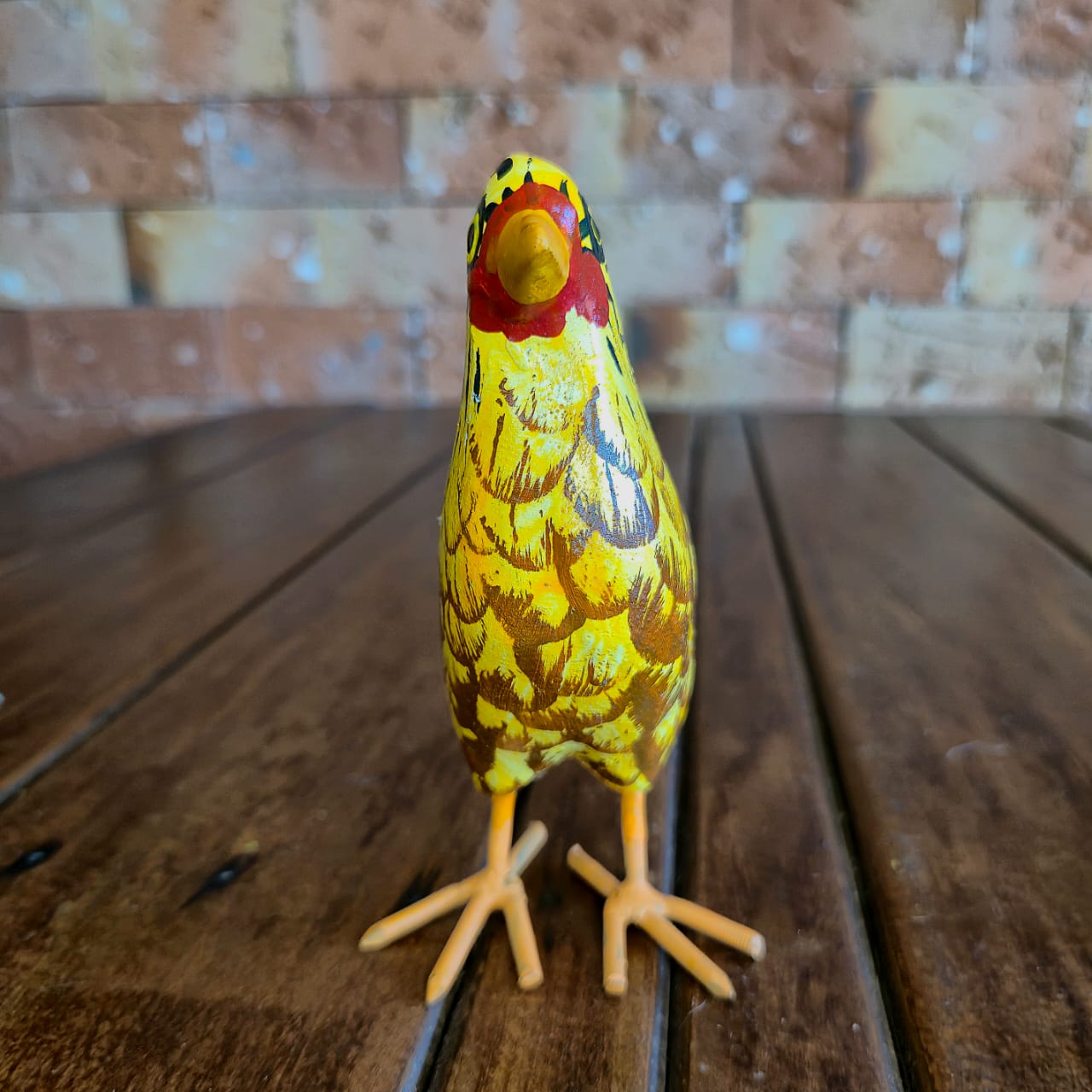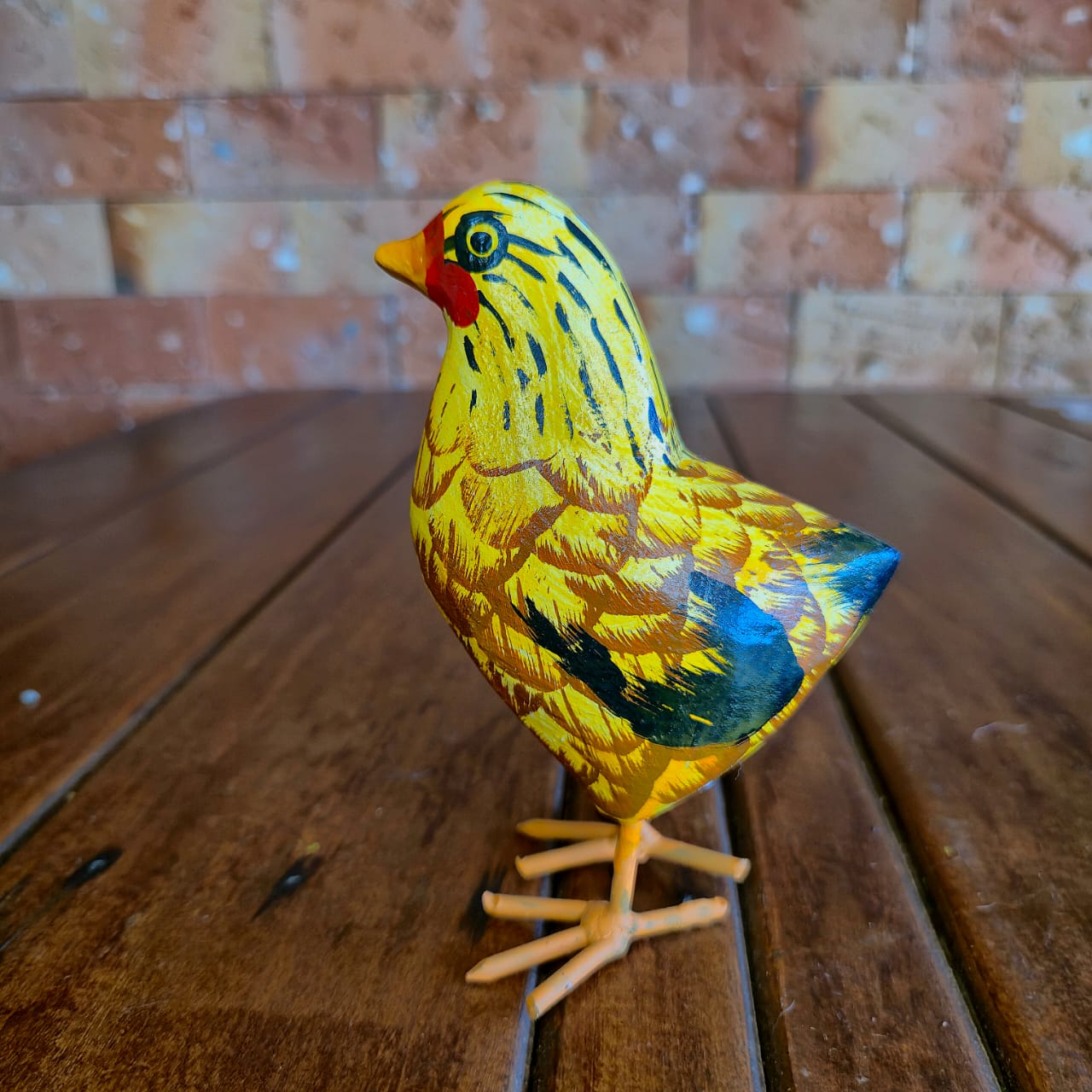 Pintinho produzido na madeira com detalhes de pintura artesanal.