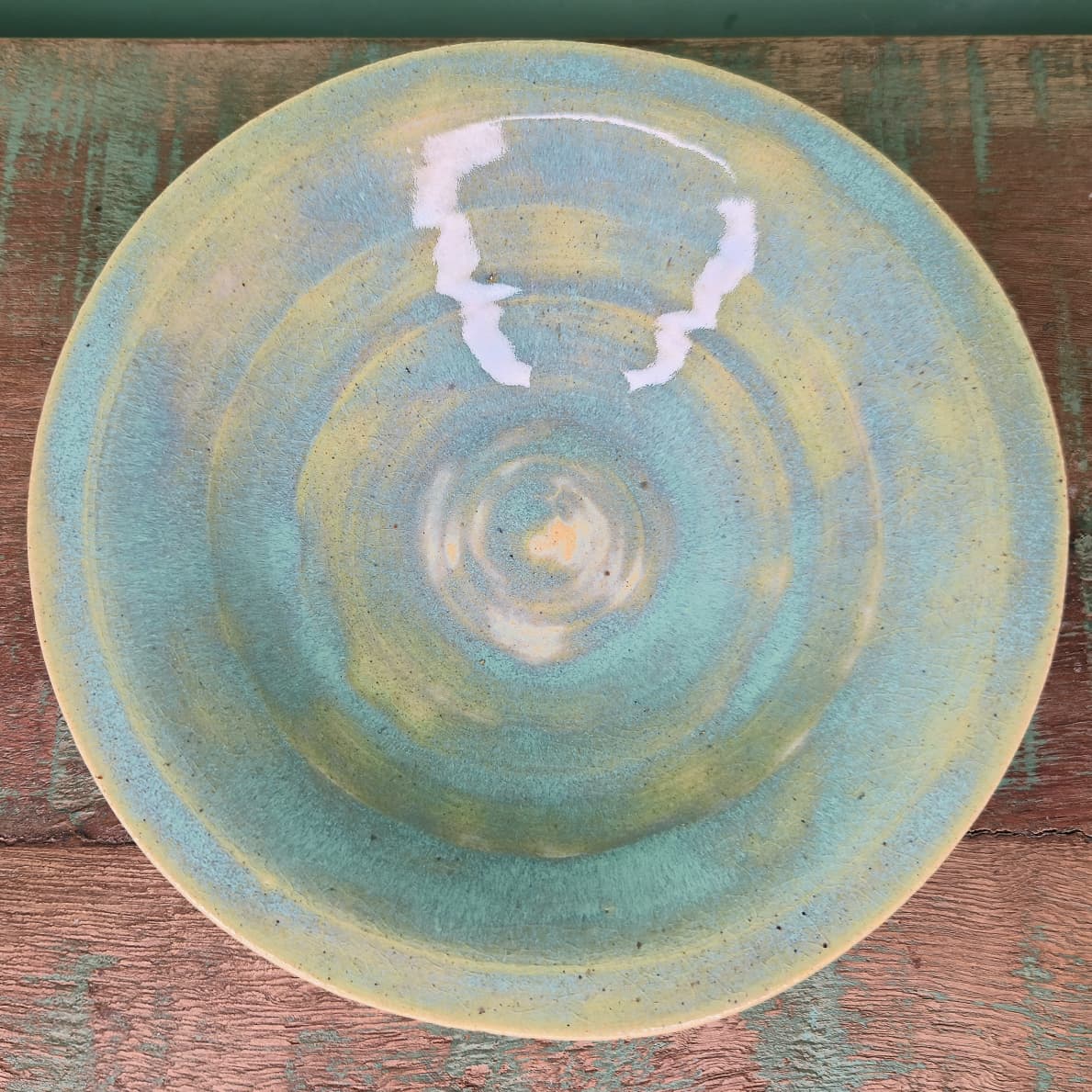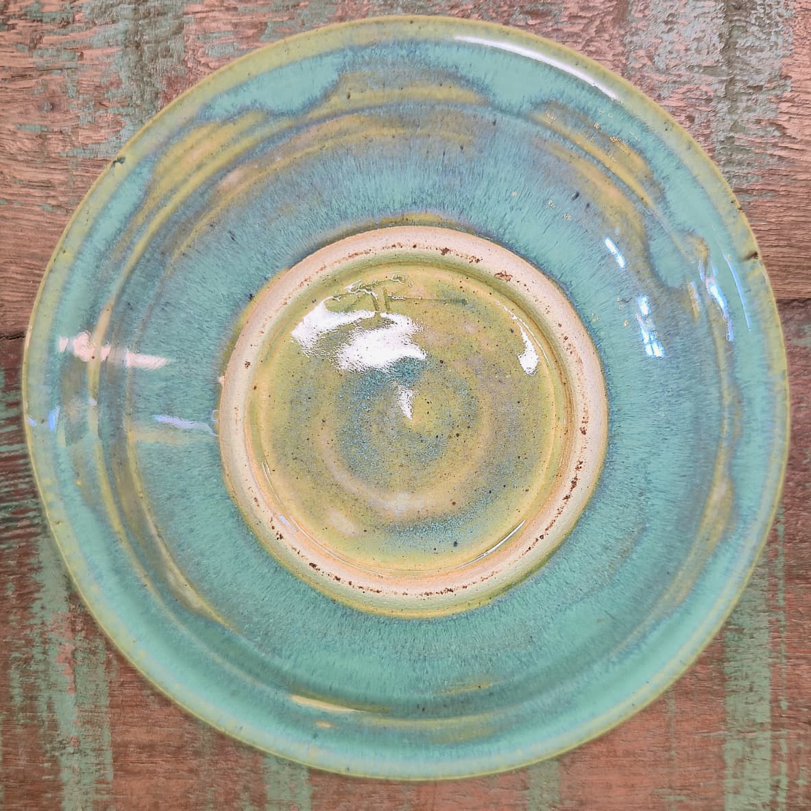 Prato em cerâmica esmaltada em detalhes azul e verde.