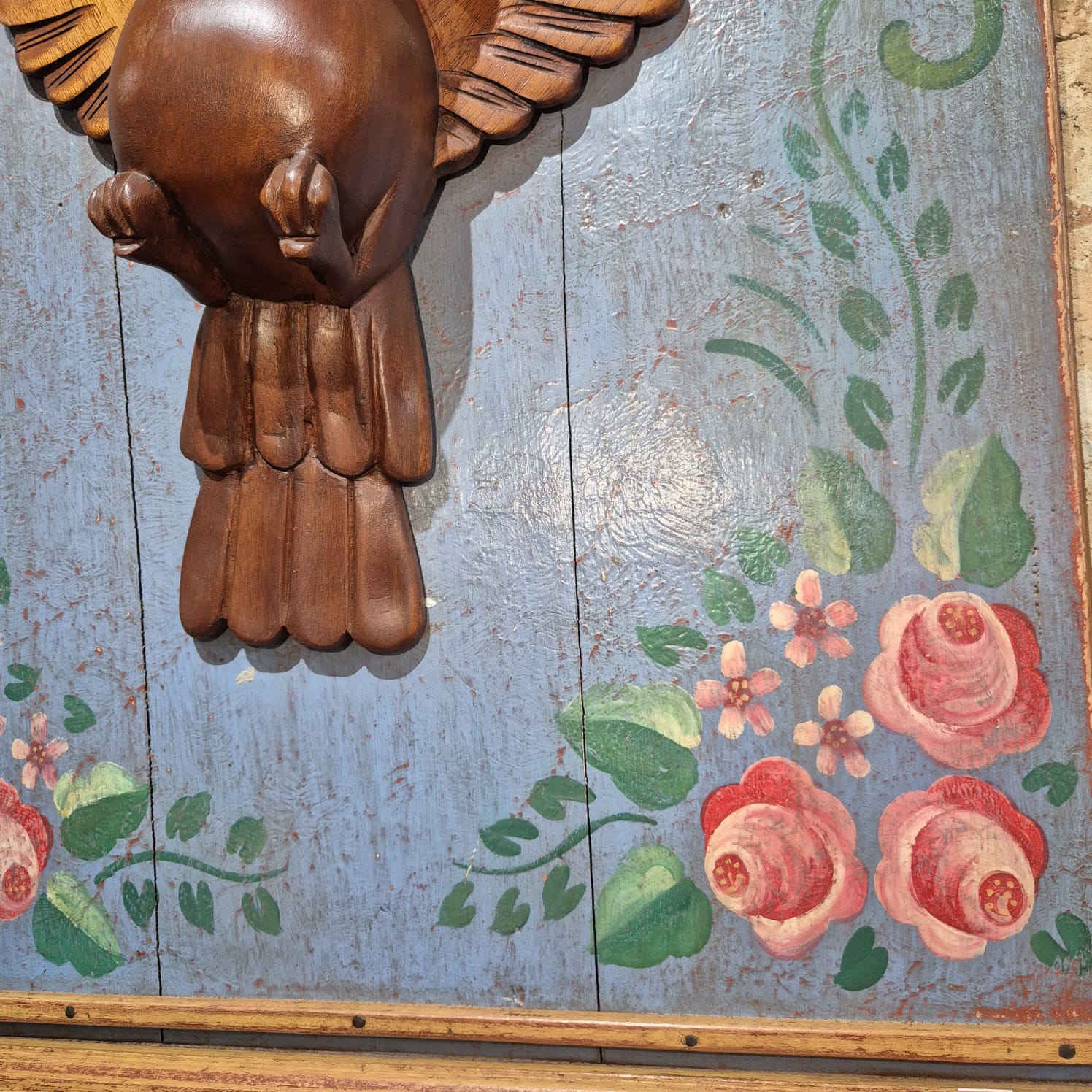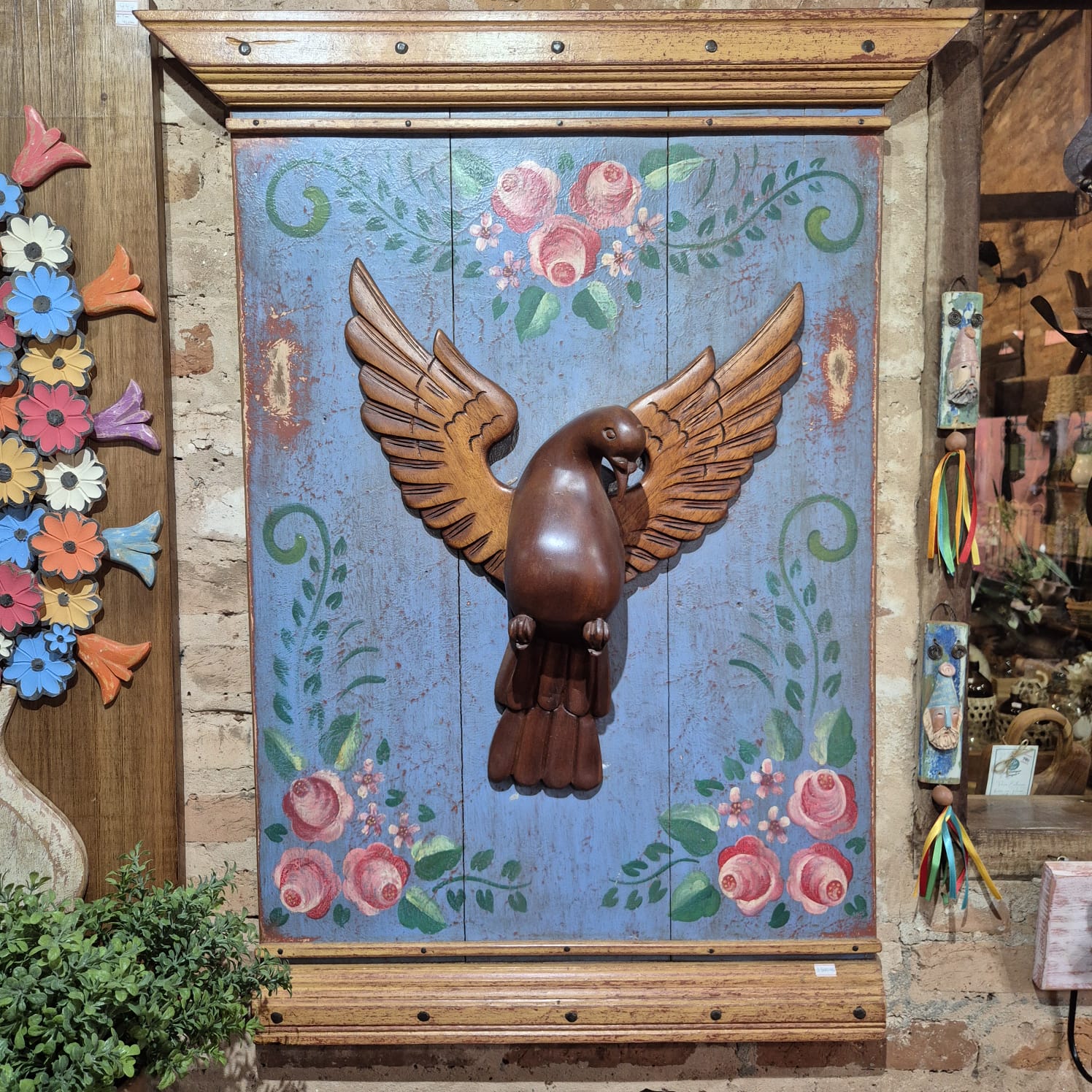 Quadro divino espirito santo com moldura nas bordas. Divino produzido na madeira esculpida.