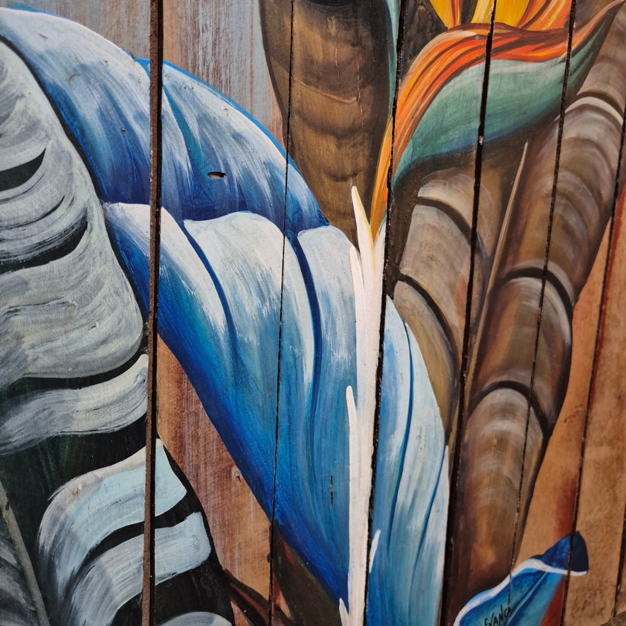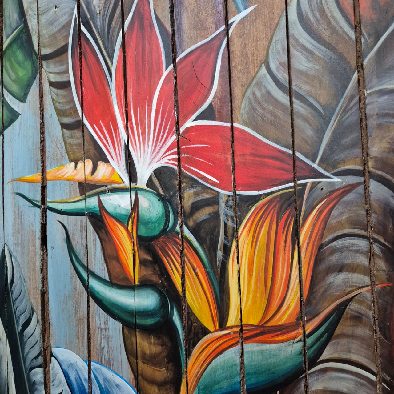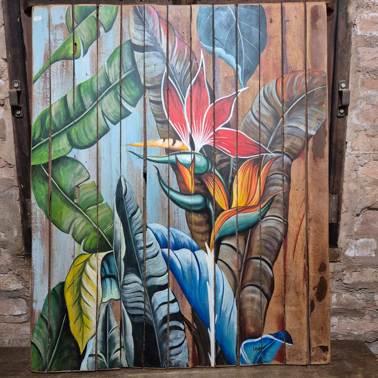 Quadro flor com folhagens produzido na madeira de demolição em detalhes.