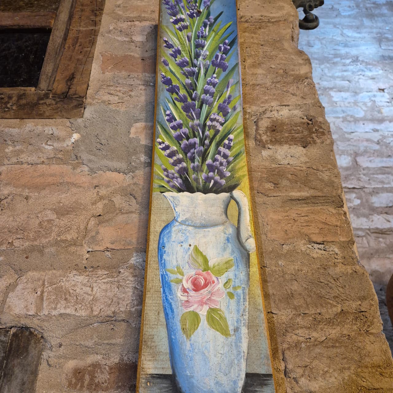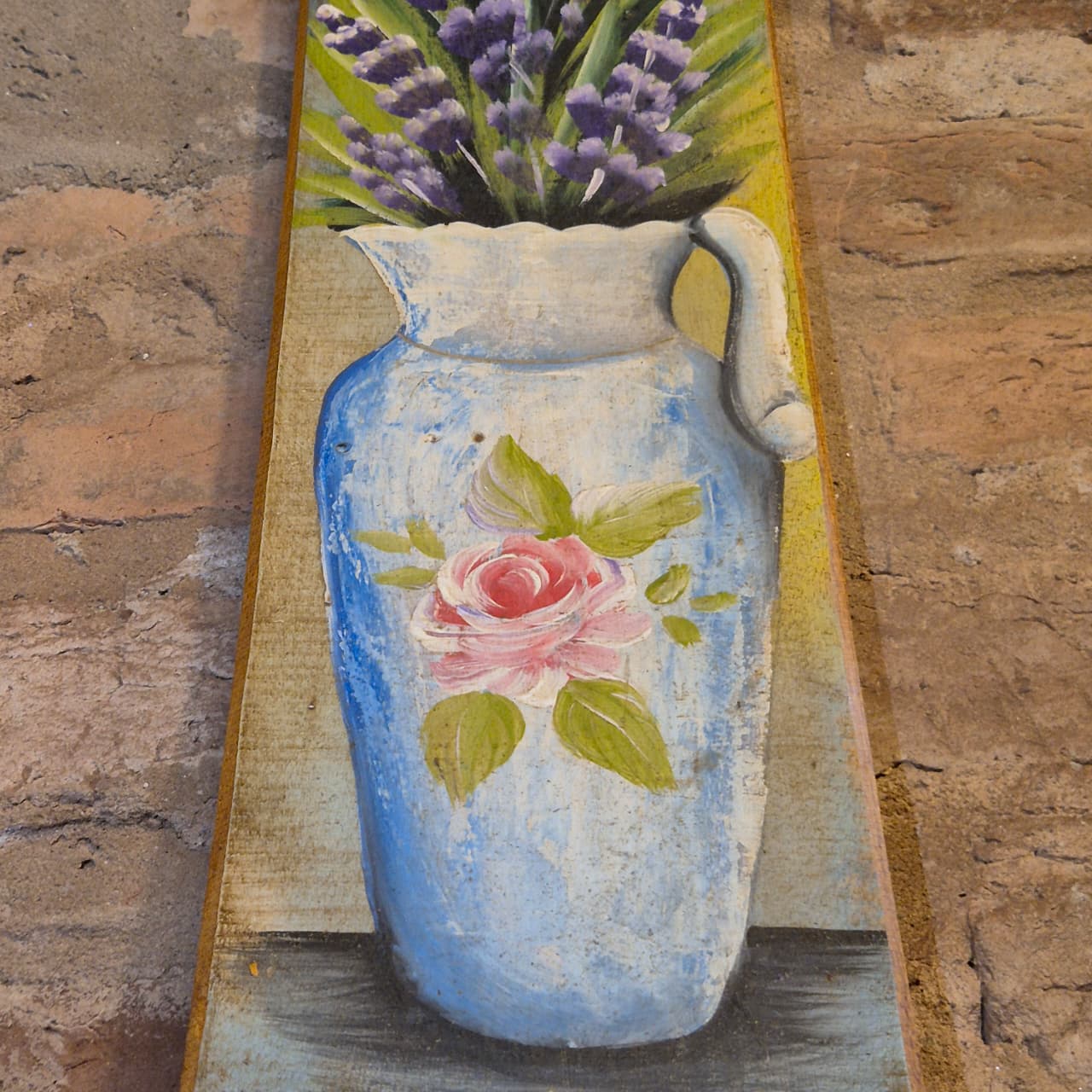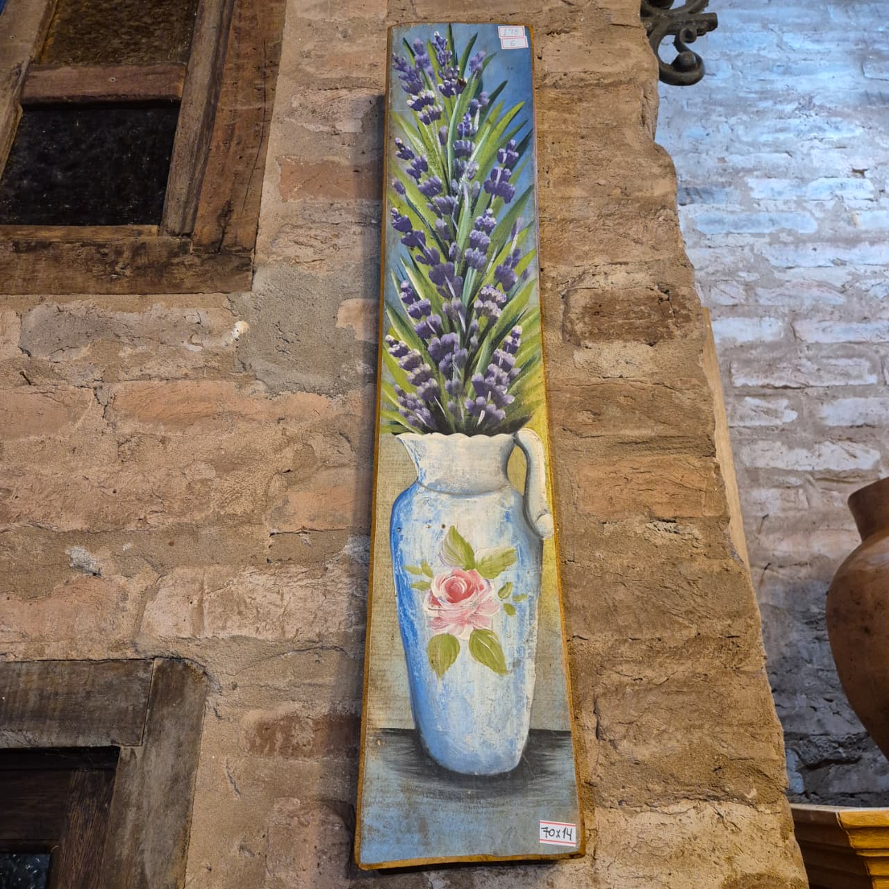 Quadro vaso de lavanda produzido em madeira abaulada.