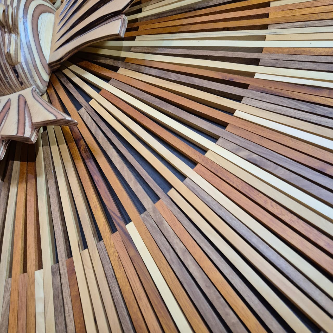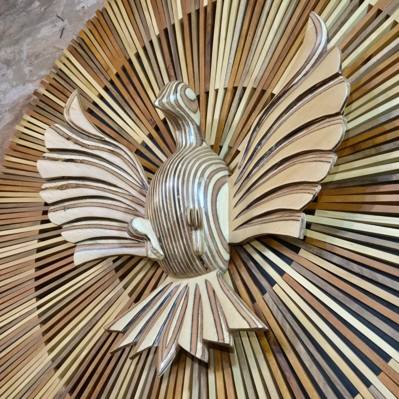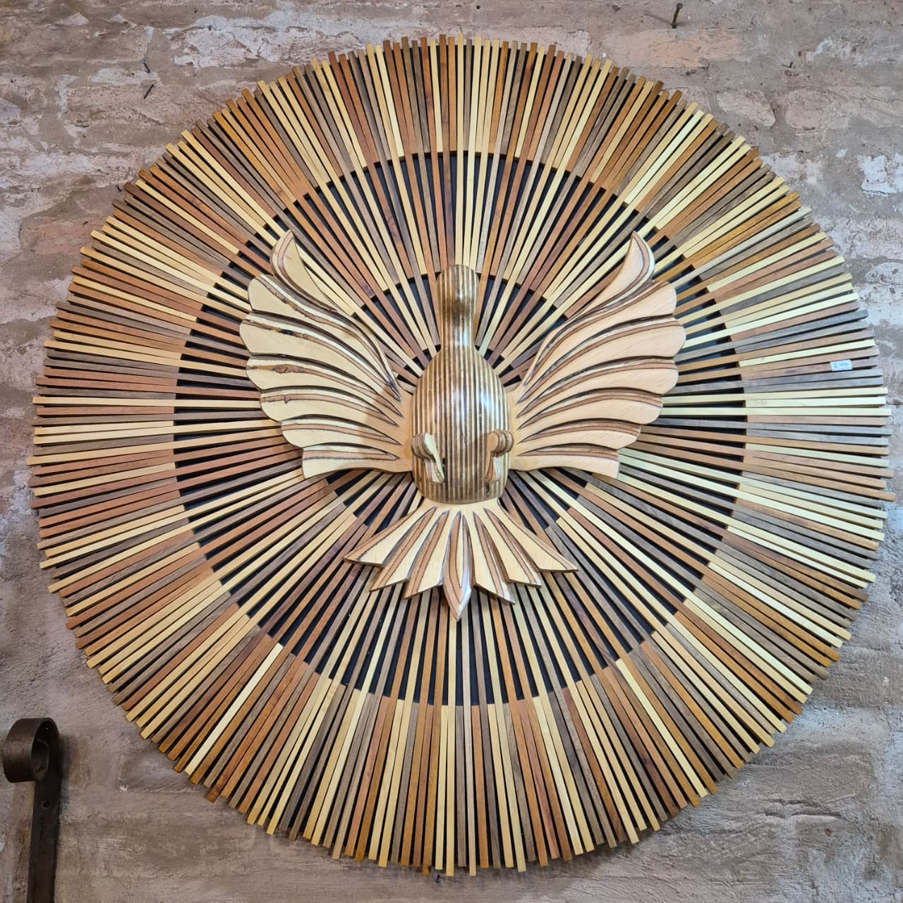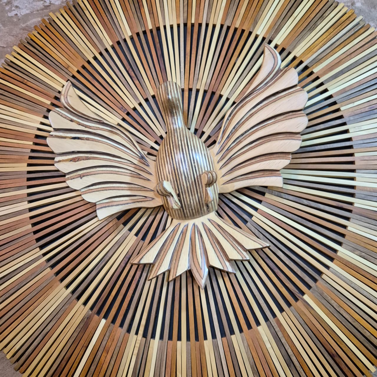 Quadro mandala divino espirito santo esculpido em madeira. Cor marrom e bege em degradê.