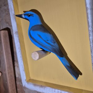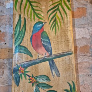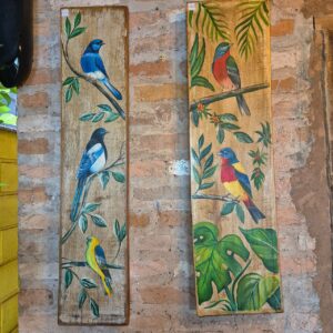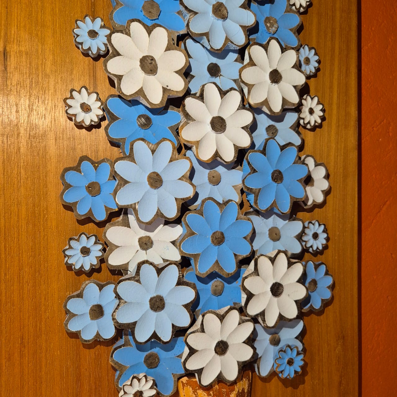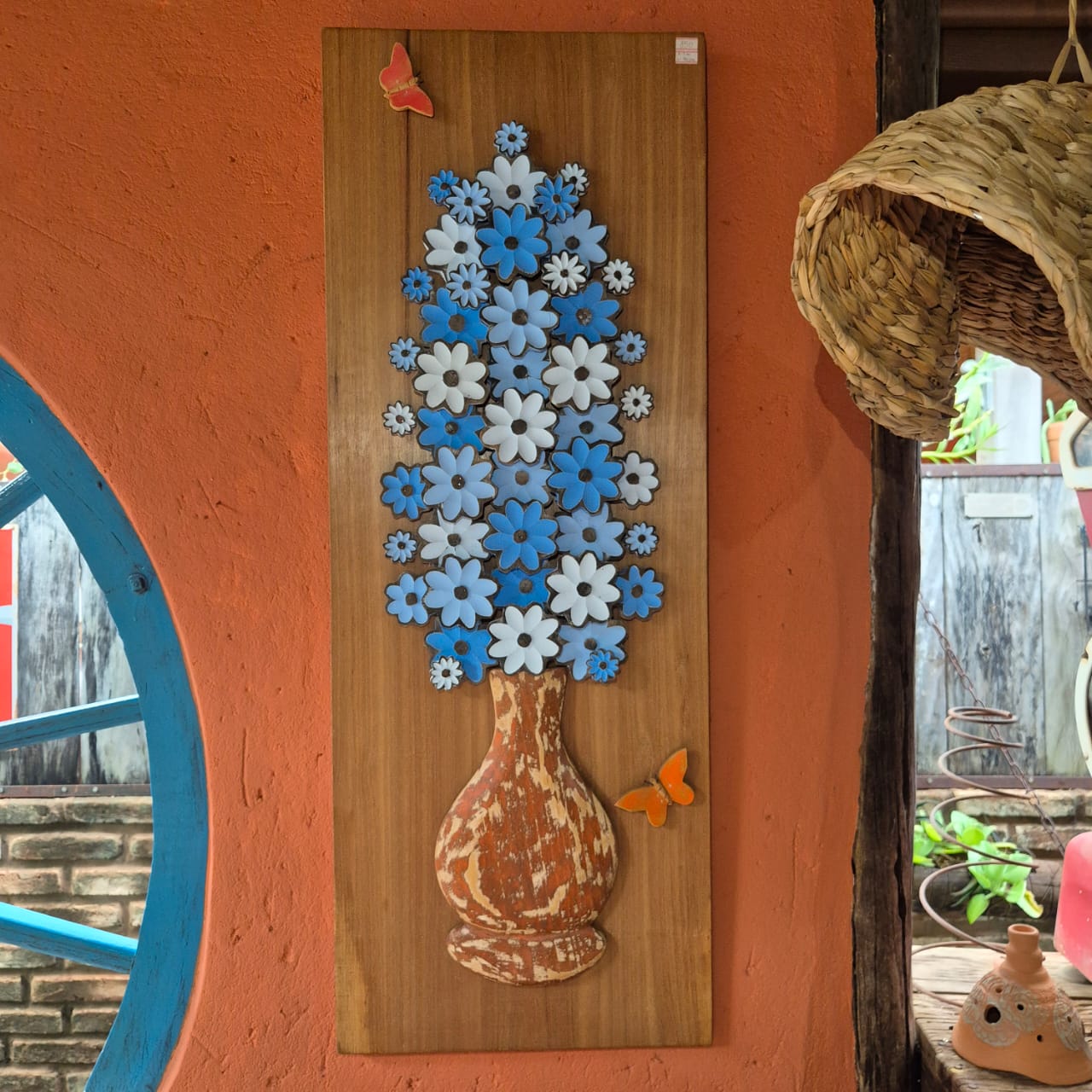 Quadro com vaso e flores esculpidos a mão e produzido em madeira de demolição.