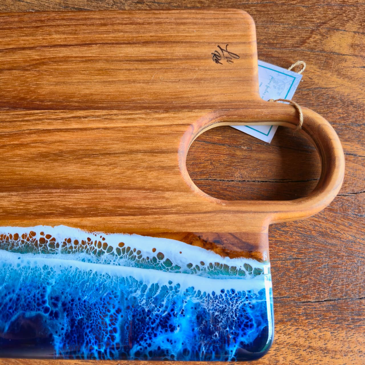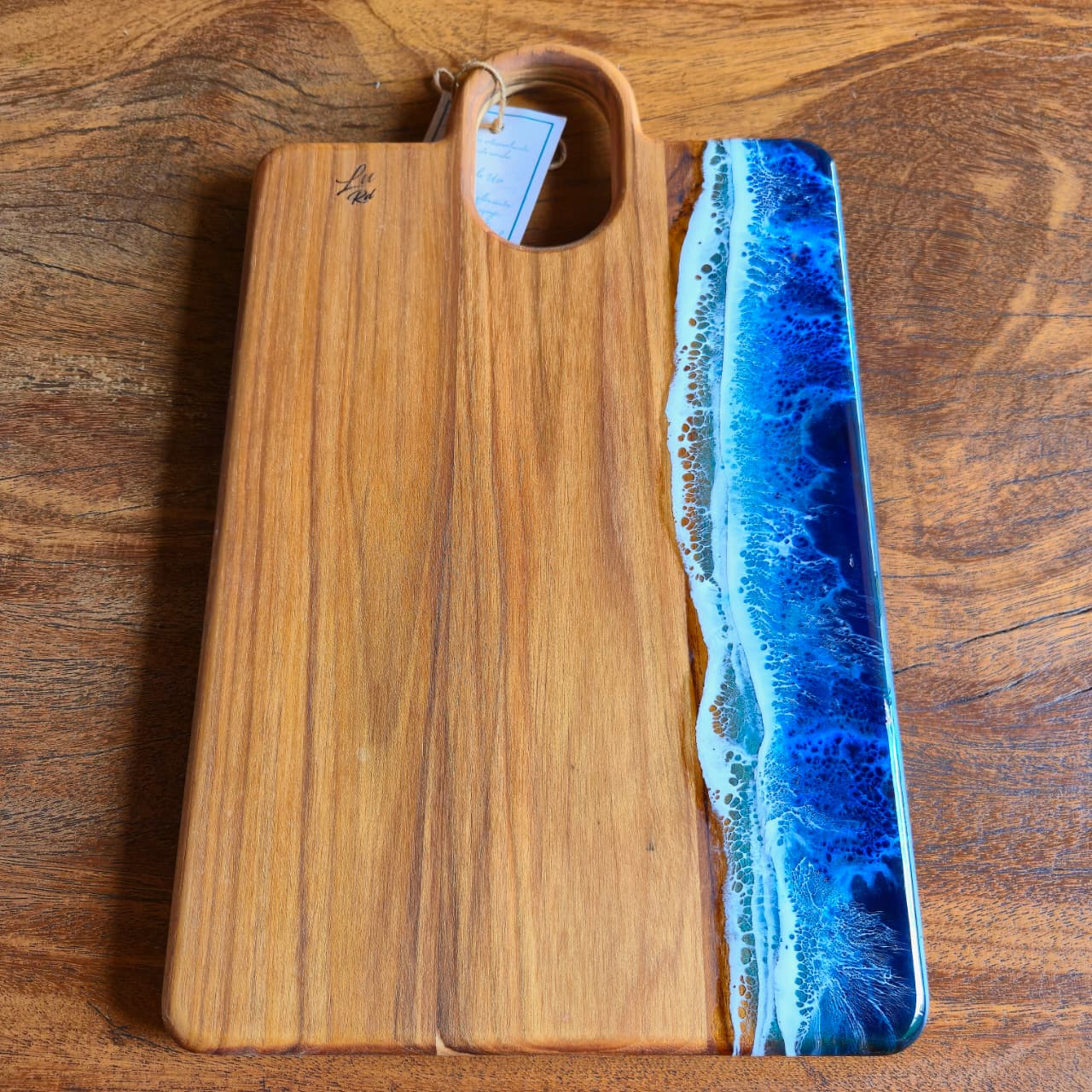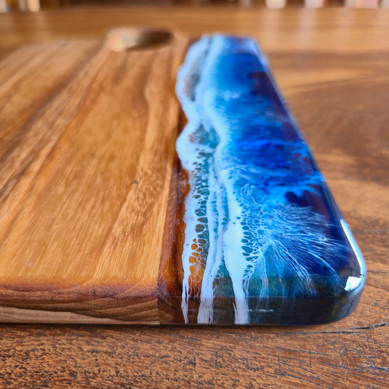 Tábua produzida na madeira teca com trabalho artesanal em resina e acabamento em óleo mineral e cera de abelha.