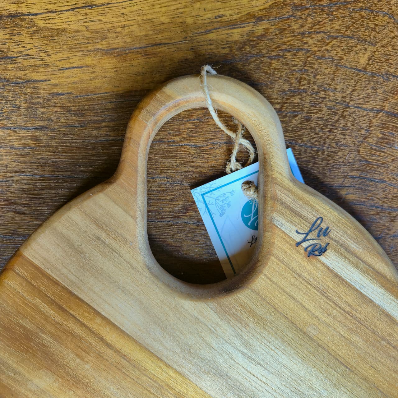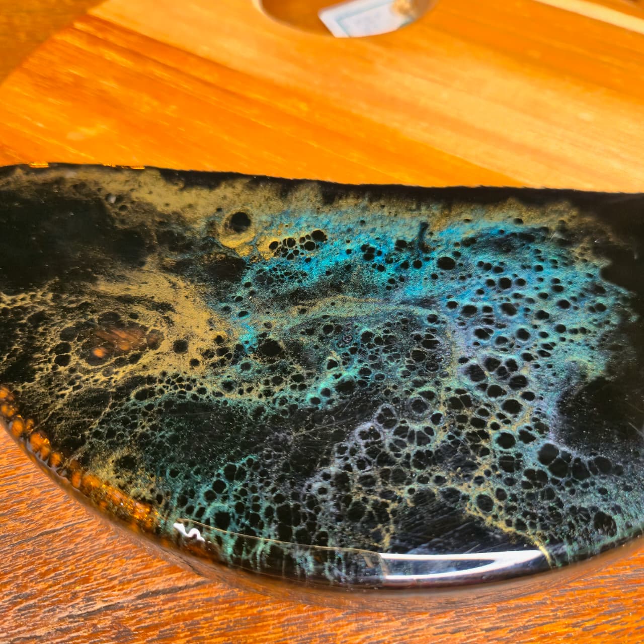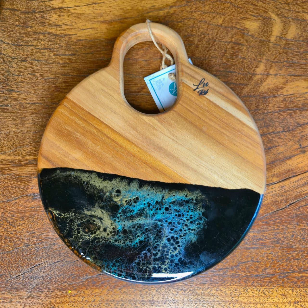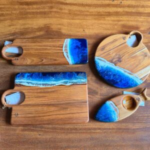Tábua produzida na madeira teca com trabalho artesanal em resina e acabamento em óleo mineral e cera de abelha.