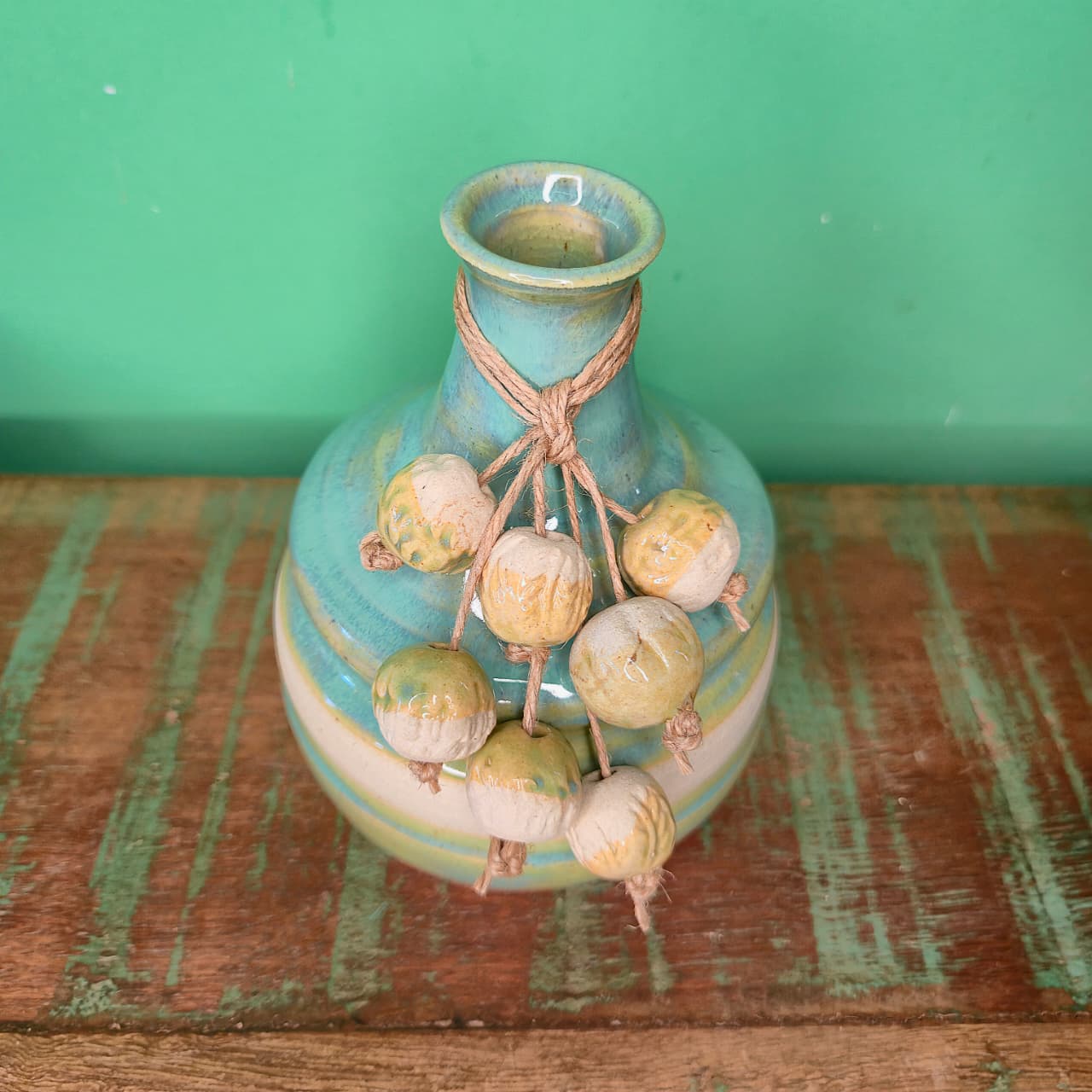 Vaso tipo moringa na cerâmica esmaltada em detalhes com degradê azul e verde. Acompanha colar.