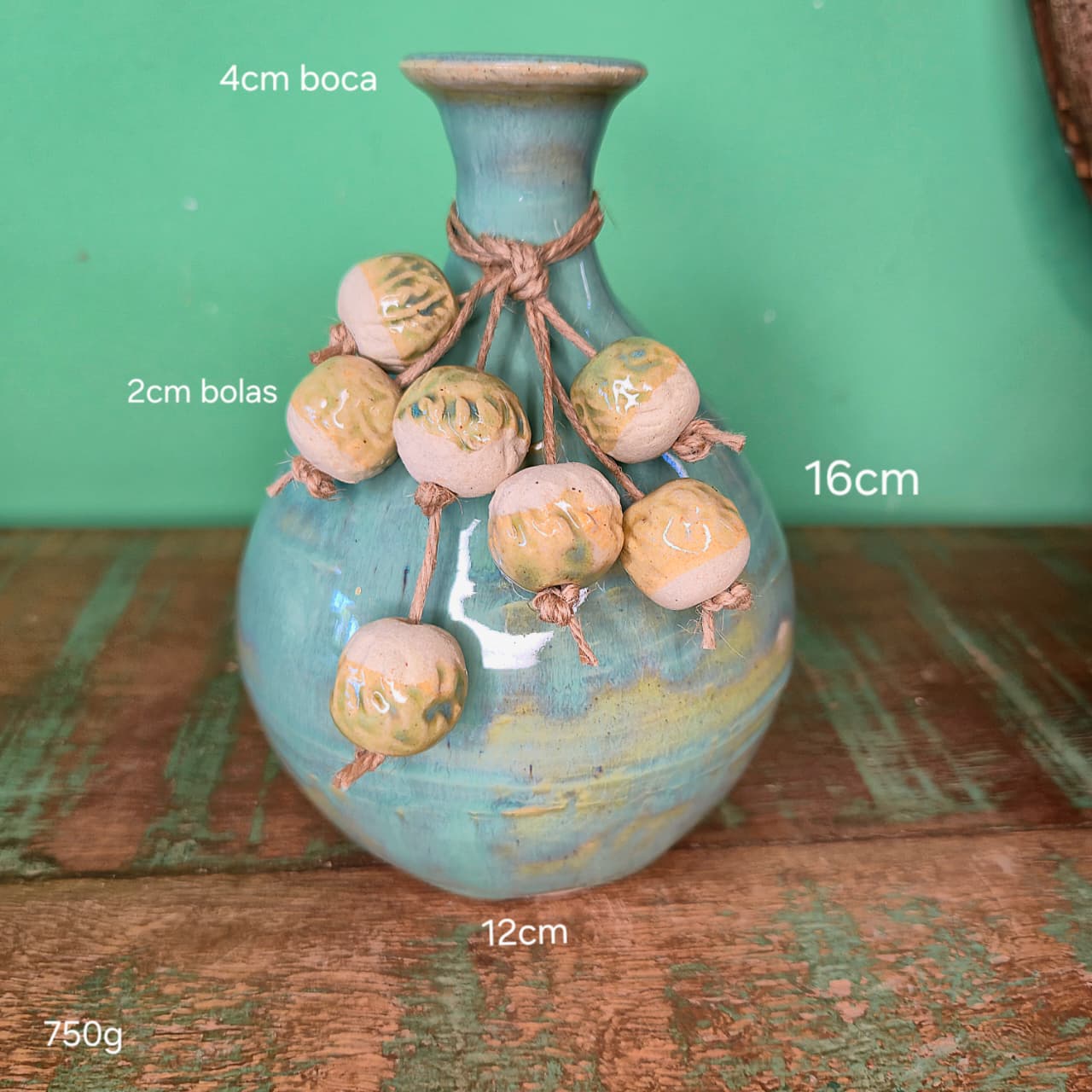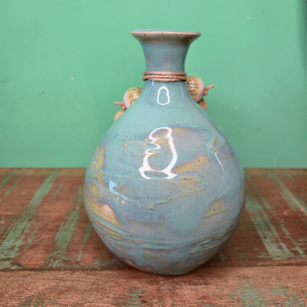 Vaso tipo moringa na cerâmica esmaltada com detalhes em degradê azul e verde. Acompanha colar.