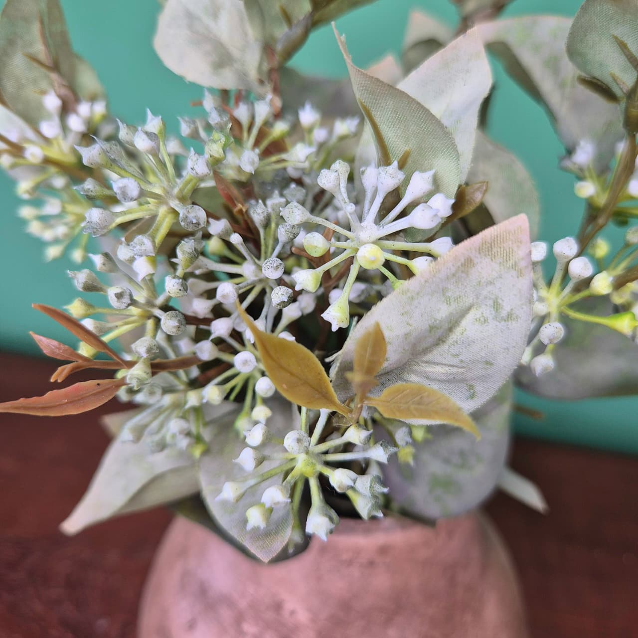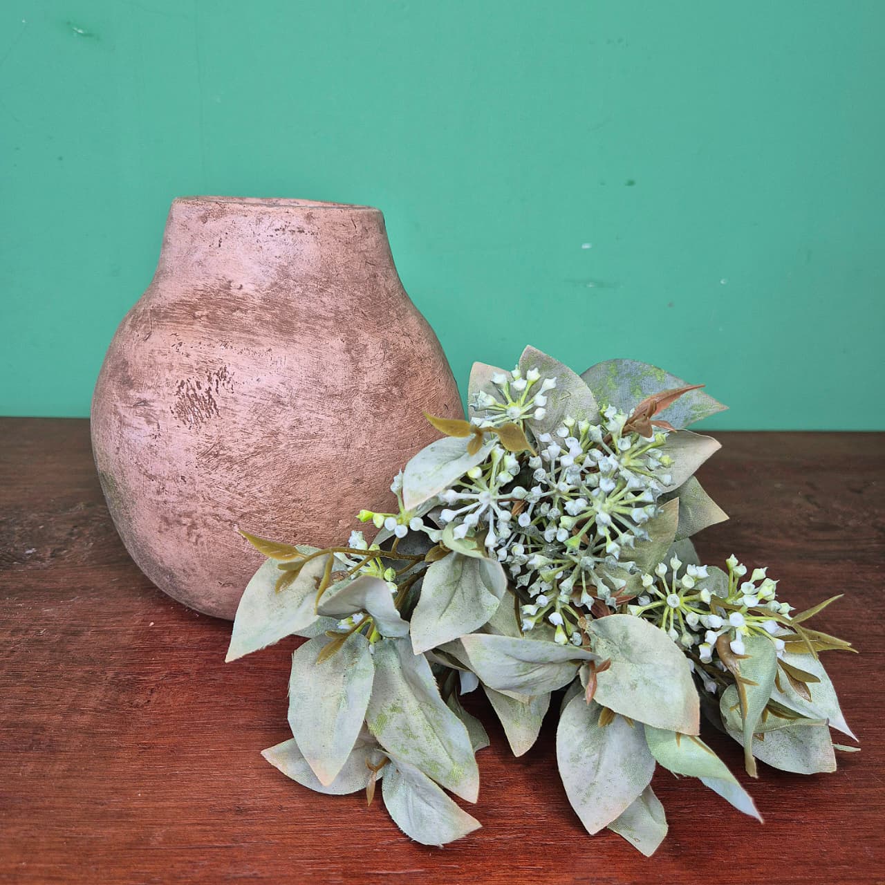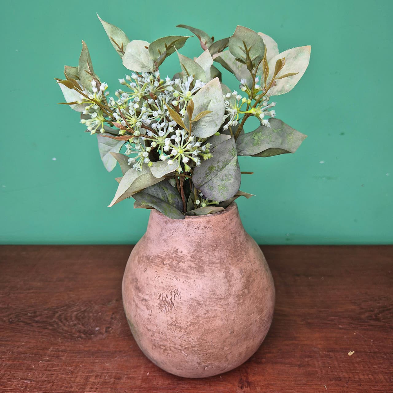 Vaso pedrinha com arranjo folhagem e brotinho de flor.